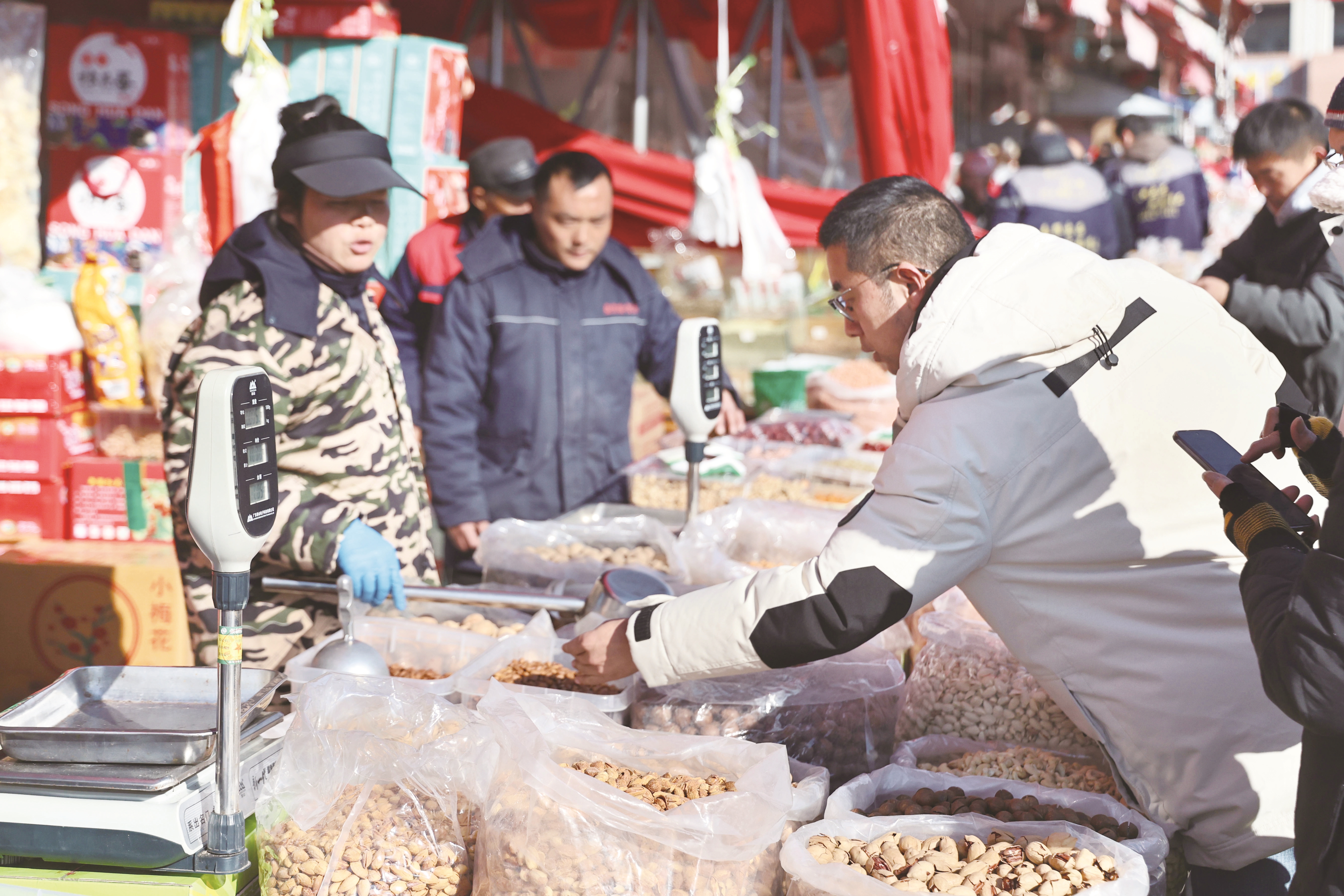 昨日,市民在南通农副产品物流中心内购买干货。临近春节,通城各类水果、蔬菜、肉类、干货等品种丰富、供应充足,吸引了不少市民选购,当前已迎来春节前的销售高峰。