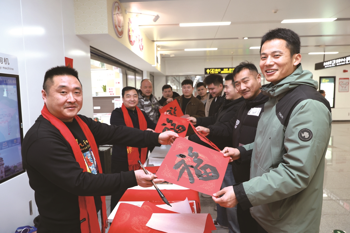 志愿服务活动现场,退役老兵书法家们凝神挥毫、笔走龙蛇,将新春的美好祝愿与军民同心的深厚情谊写在大红“福”字与春联之上;身着红色马甲的退役军人志愿者穿梭其间,主动为地铁站工作人员、过往乘客送上年画、“福”字和新春问候,一句句真诚的祝福、一副副喜庆的春联,让人们在匆匆步履中感受到浓浓的年味与尊崇暖意。