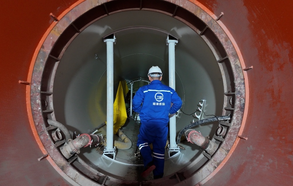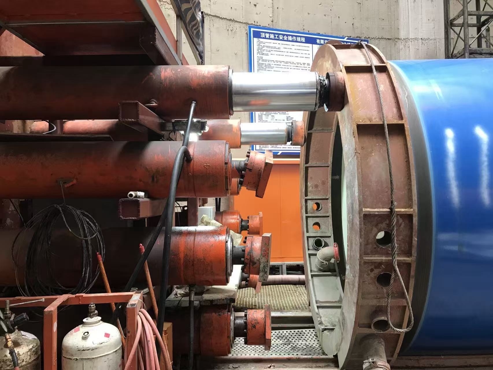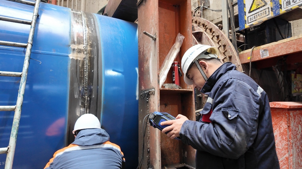 井下,前方顶管机缓缓掘进,后方千斤顶则以4厘米/分的速度,稳稳将钢管向前推进。一节9米长的管道,无法一次顶完。顶进3米,千斤顶收回,吊装一块3米长的顶铁嵌入;再顶3米,再收回,再加顶铁;如此反复3次,一节钢管才算完整顶入。整个过程,耗时近4小时。一节顶完,另一节再吊入井内,拼管后焊接、检测……确保每道焊缝达到一级标准,管节错位偏差在毫米级内,能扛住江底40米深超高水压的考验。检测合格,刷漆防腐,油漆固化又得1小时多。随后再次重复这一系列工序,平均每天顶进距离只有13.5米。