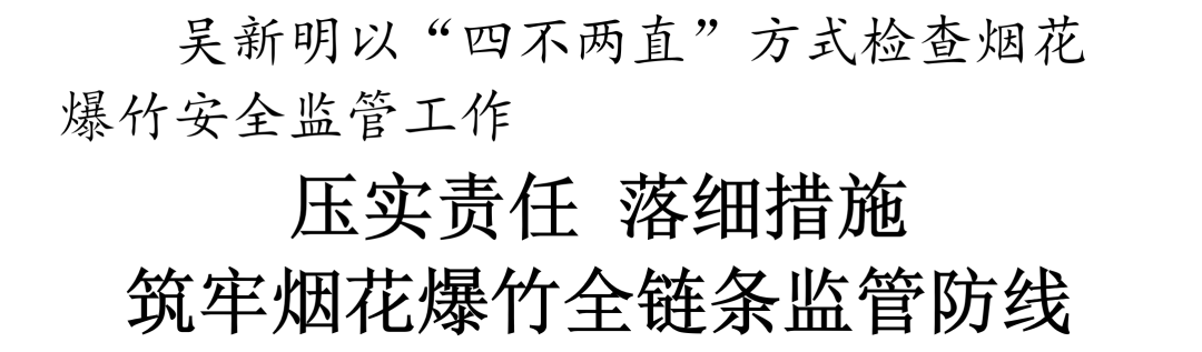 检查中,吴新明强调,春节元宵节期间是烟花爆竹燃放高峰,安全风险凸显,各地各部门要提高政治站位,坚持举一反三、防患未然,落细落实“五个严禁、三个务必”要求,扎实开展风险隐患排查整治,切实做好烟花爆竹生产、运输、销售、燃放全链条安全监管。要严格落实相关规定,加强烟花爆竹零售店(点)、储存点现场管理及周边安全管控,严防“下店上宅”、超量储存、店外摆放、人员聚集,加强重点场所检查排查,严防违法违规存储烟花爆竹,严厉打击非法储存、经营烟花爆竹等行为。要加强宣传引导,严格做好烟花爆竹从业人员的安全教育提醒,普及烟花爆竹安全知识,及时制止各类不安全行为,营造全社会共同参与的安全管理氛围。