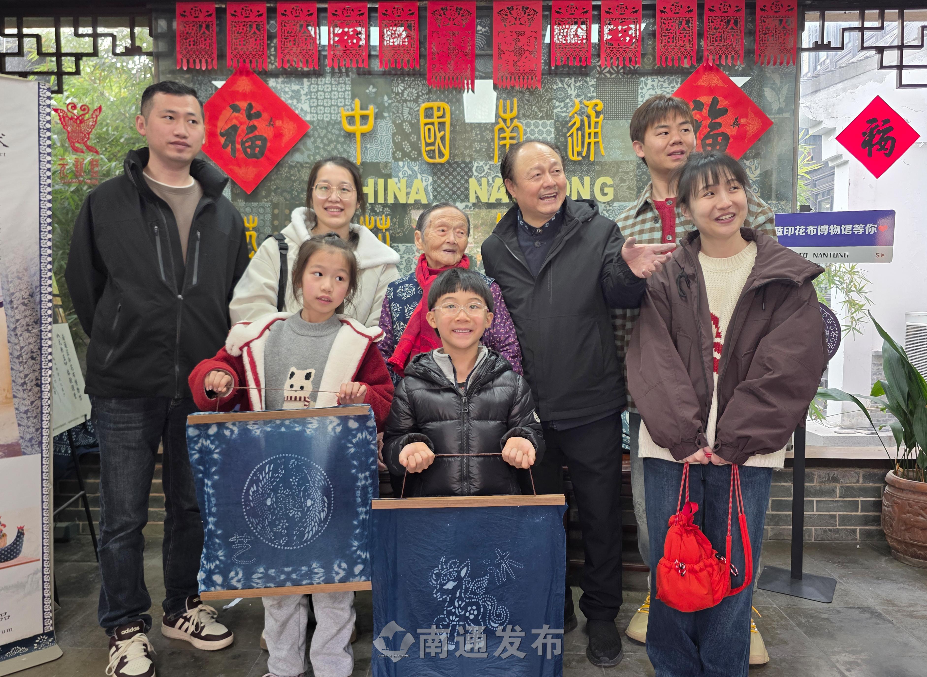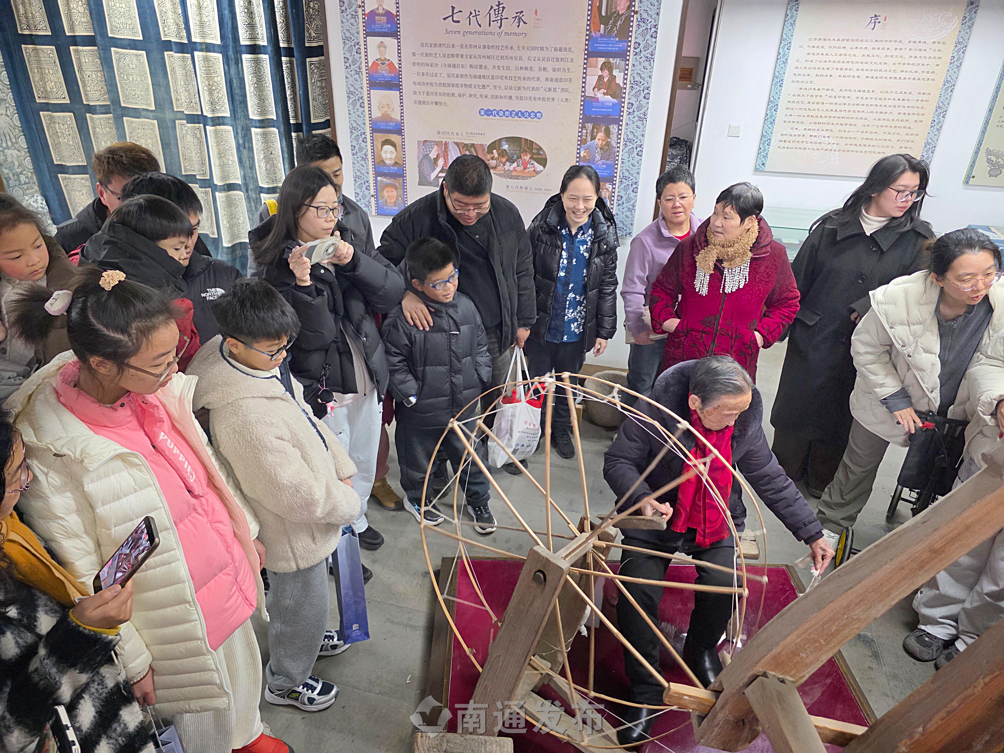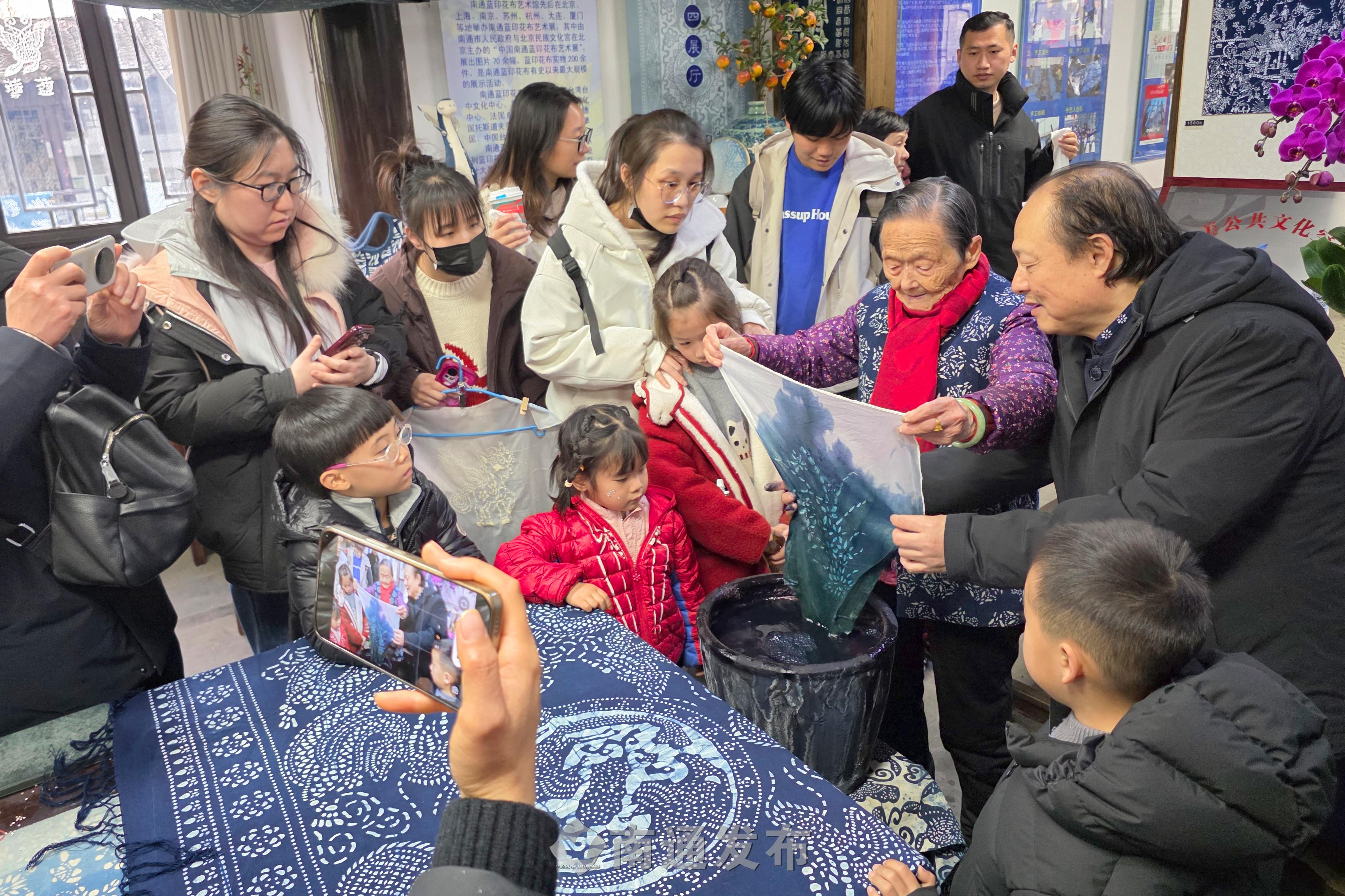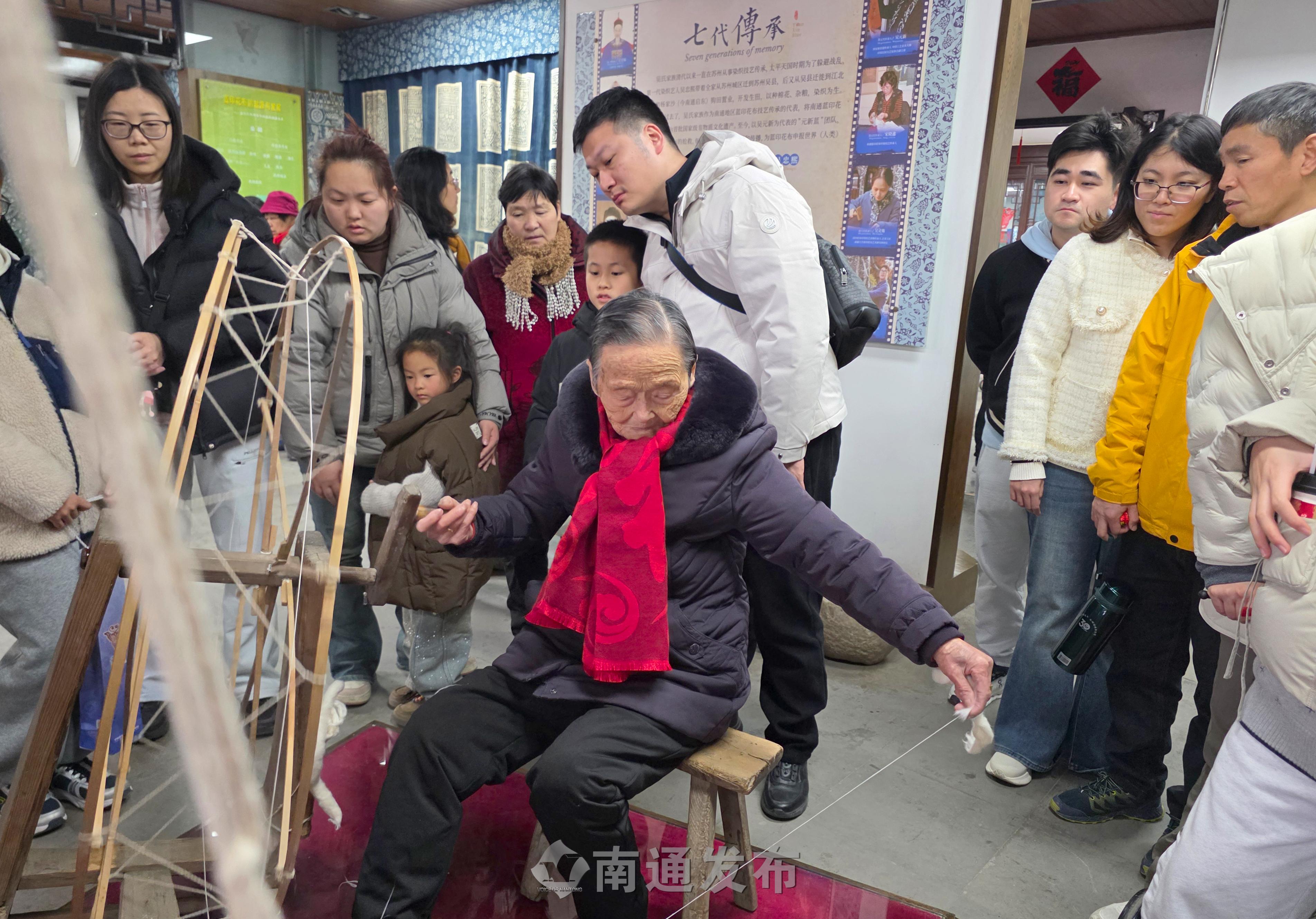 2026年2月19日在南通蓝印花布博物馆拍摄的画面。99岁管惠芳非遗传承人演示染织技艺,春节假期以来,每天都有2000多位市民、游客来到南通蓝印花布博物馆参观、体验国家级非物质文化遗产蓝印花布印染技艺,制作蓝染方巾、围巾等,感受身边非物质文化遗产的魅力。
