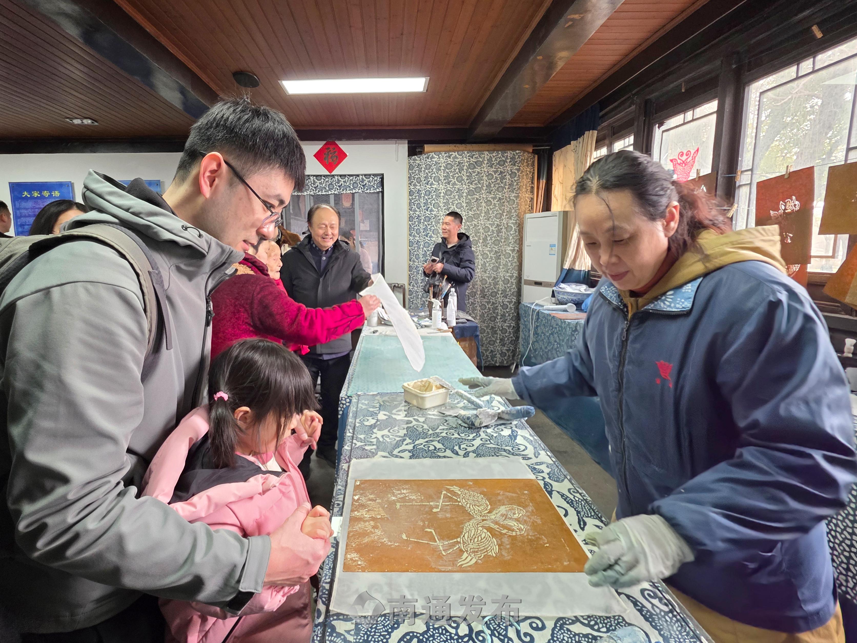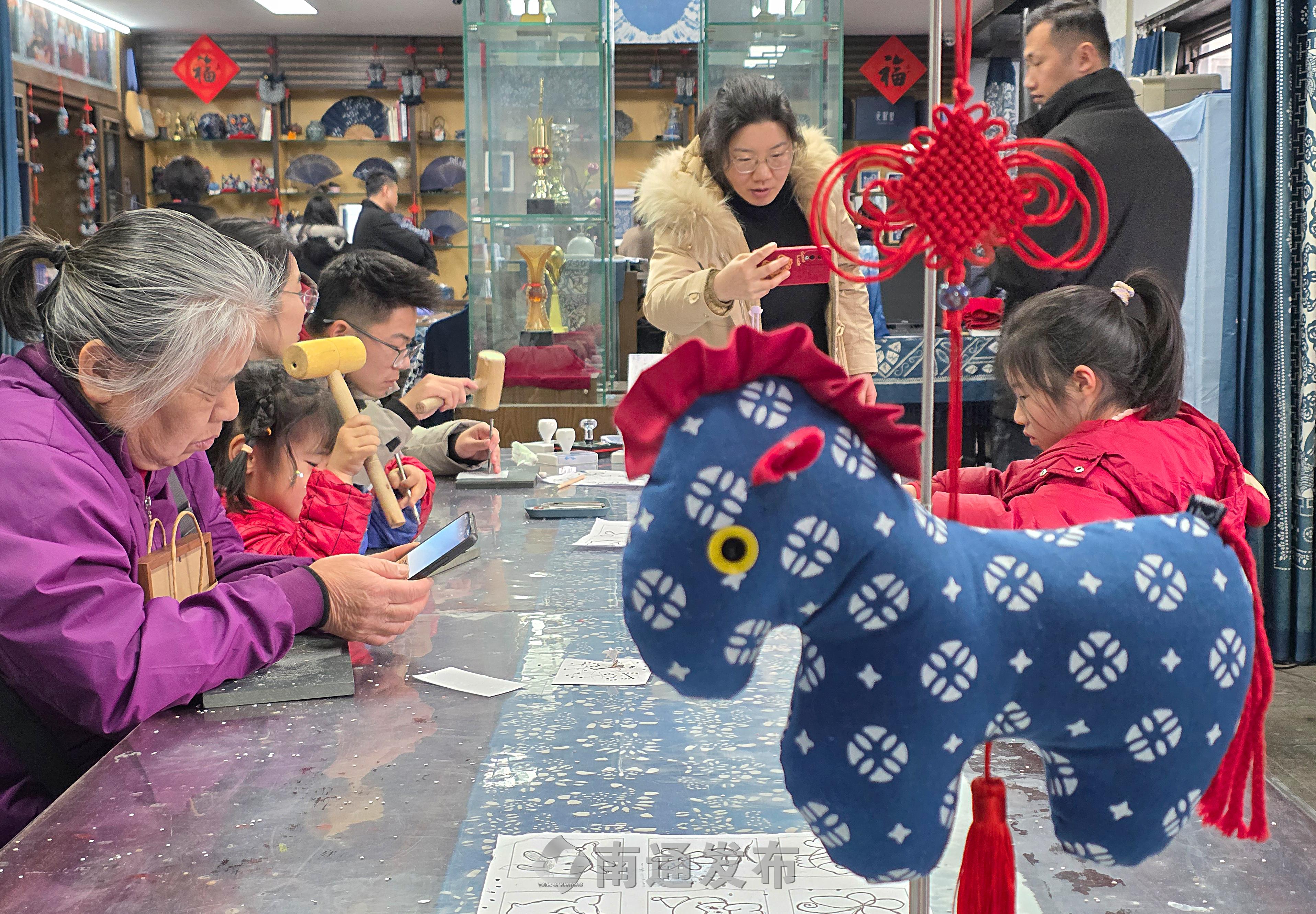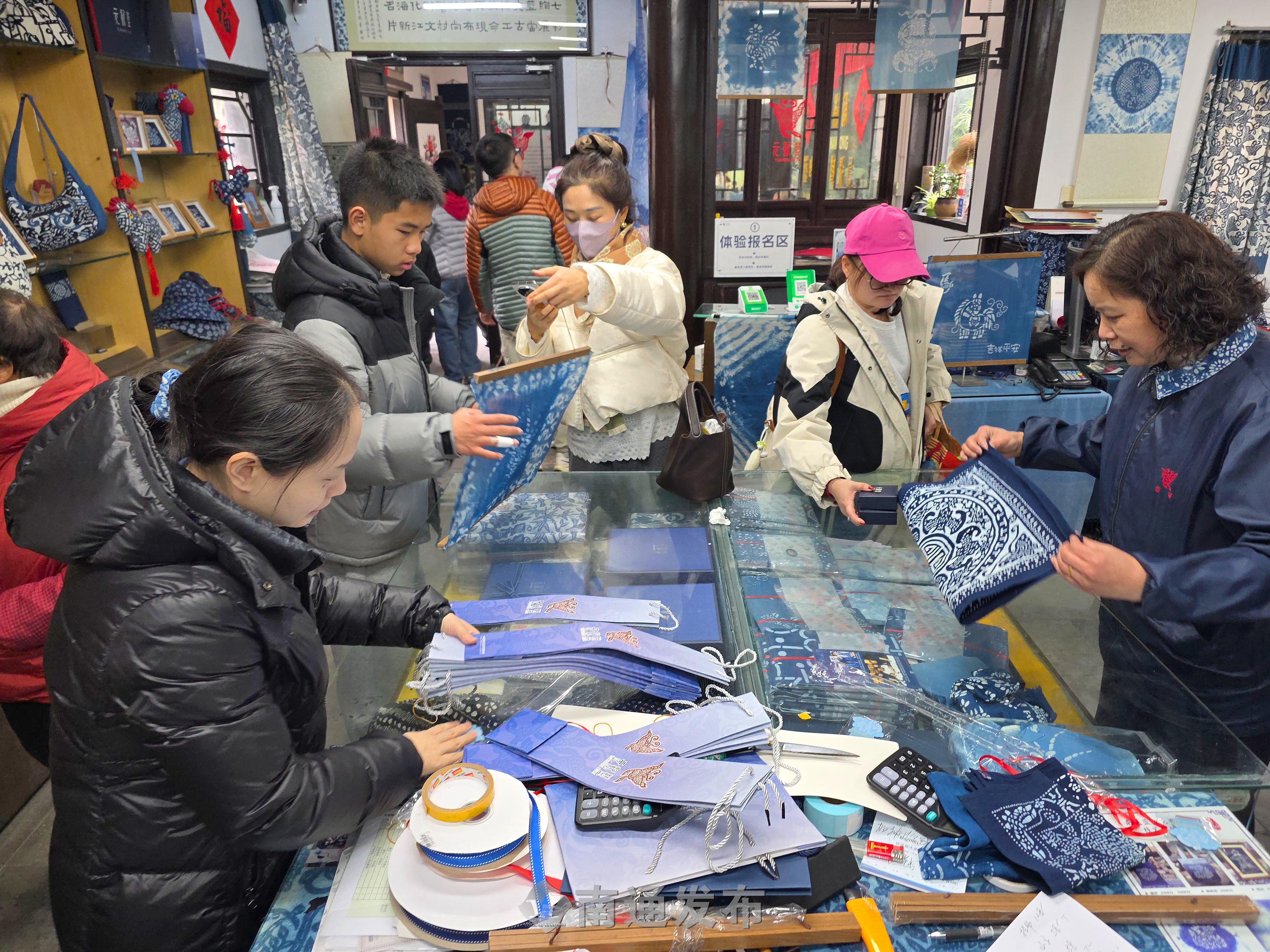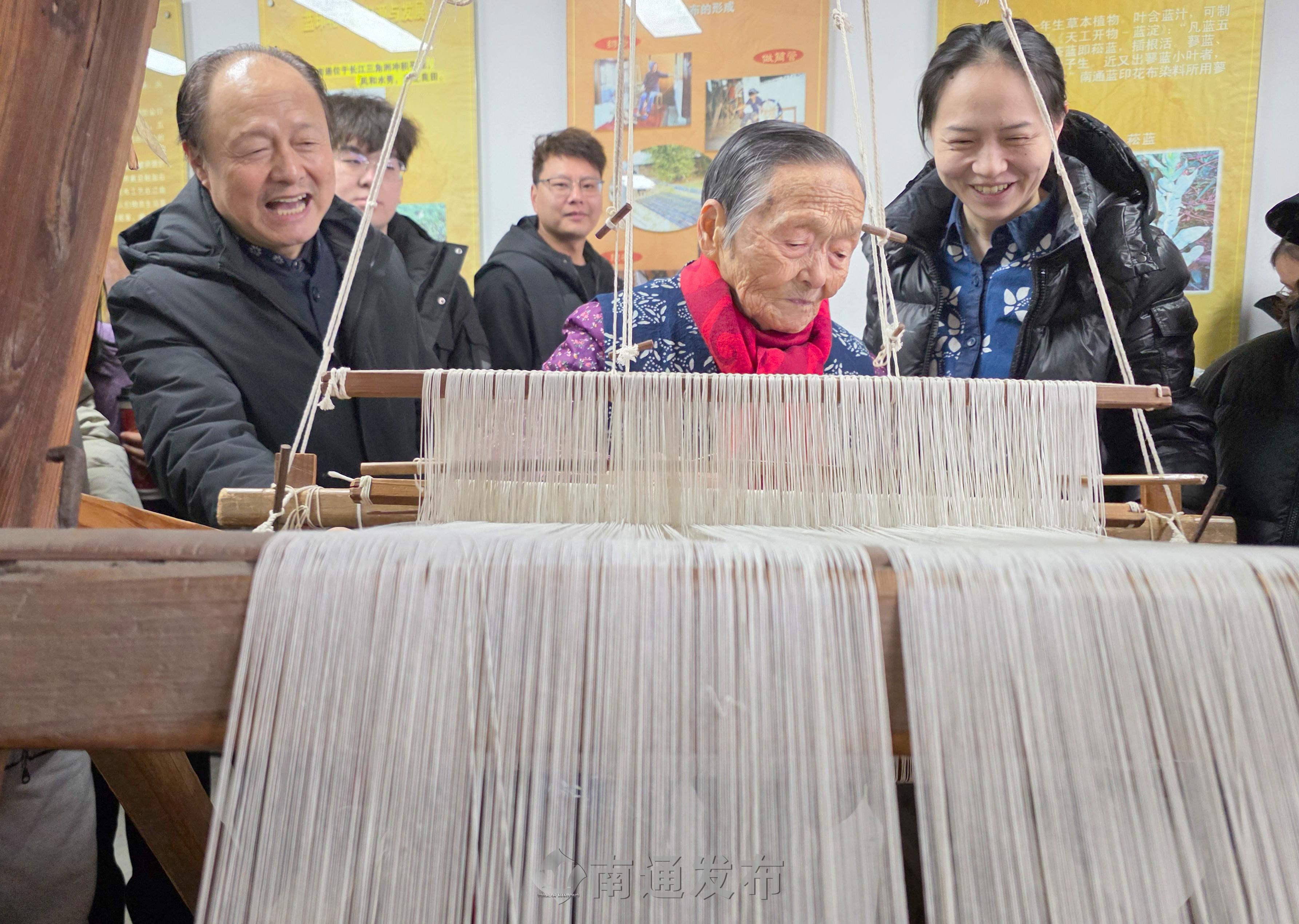 2026年2月19日在南通蓝印花布博物馆拍摄的画面。99岁管惠芳非遗传承人演示染织技艺,春节假期以来,每天都有2000多位市民、游客来到南通蓝印花布博物馆参观、体验国家级非物质文化遗产蓝印花布印染技艺,制作蓝染方巾、围巾等,感受身边非物质文化遗产的魅力。