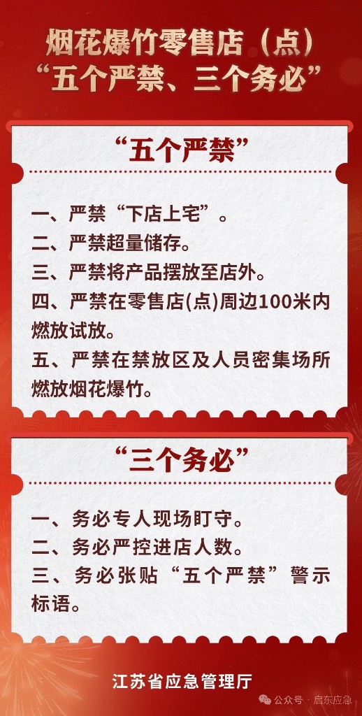 此外,为进一步压实安全责任链条,启东市构建多层级驻点监管机制:全市所有烟花爆竹零售店,均由属地区镇安排机关干部驻点值守,全程盯紧安全风险;全市5家烟花爆竹批发公司,由启东市应急管理局安排专人驻点监管,通过源头批发、终端零售到规范燃放的全链条管控,拧紧责任螺丝,确保各类风险隐患早发现、早预警、早处置。