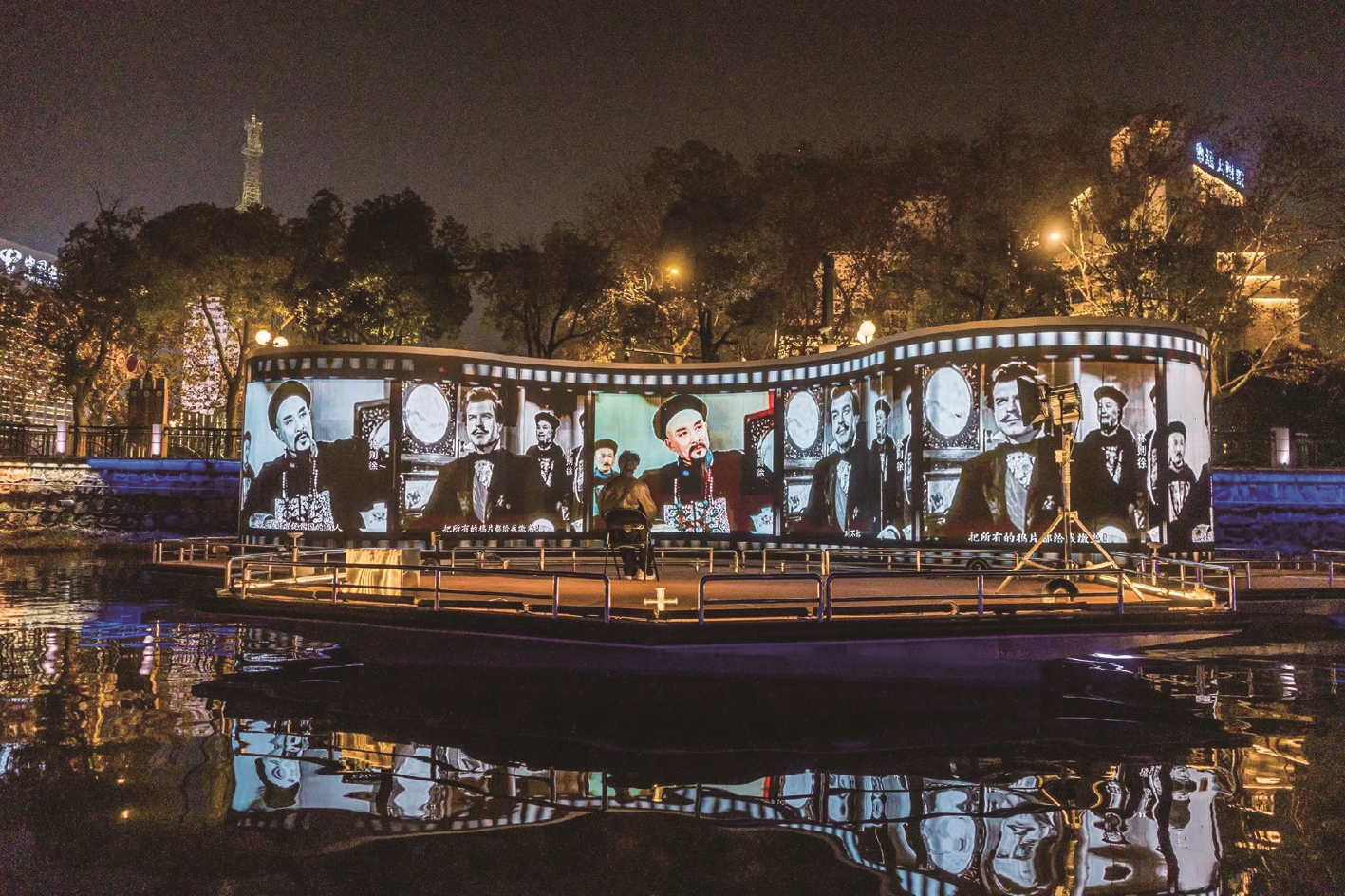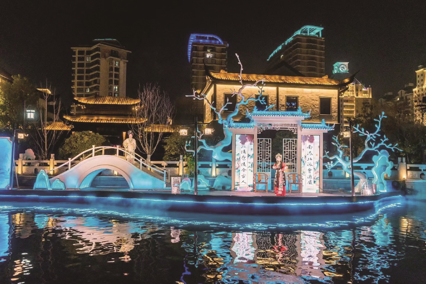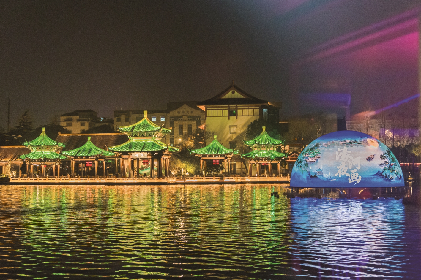 濠河被誉为南通城的“翡翠项链”。“濠河夜画”是濠河景区水岸联动更新升级核心项目,以“打造夜游场景、演绎通城故事、联动水岸空间、尽享沉浸体验”为设计理念,沿濠河游船动线,在濠西书苑及盆景园、中公园及南公园、博物苑及群英馆、濠东绿地及城隍庙等四个片区,打造了八大篇章、二十处观赏场景,并通过声光电技术和真人实景演艺,构建出了一部“可航行的城市光影剧本”,生动呈现了南通深厚的实业传统、人文积淀与城市愿景。与此同时,景区还对沿线导览标识和夜景照明进行了优化升级,增设互动打卡装置与诗词光影点缀,让游客真正从“匆匆过客”转变为“沉浸体验者”。