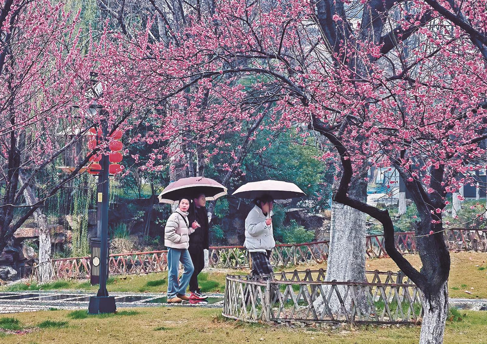 昨日春雨绵绵,崇川区濠东绿地小梅园内,盛开的红梅经春雨滋润,更显娇艳。游人撑伞漫步园中,人景相融,烟雨入画,春意盎然。通讯员李斌