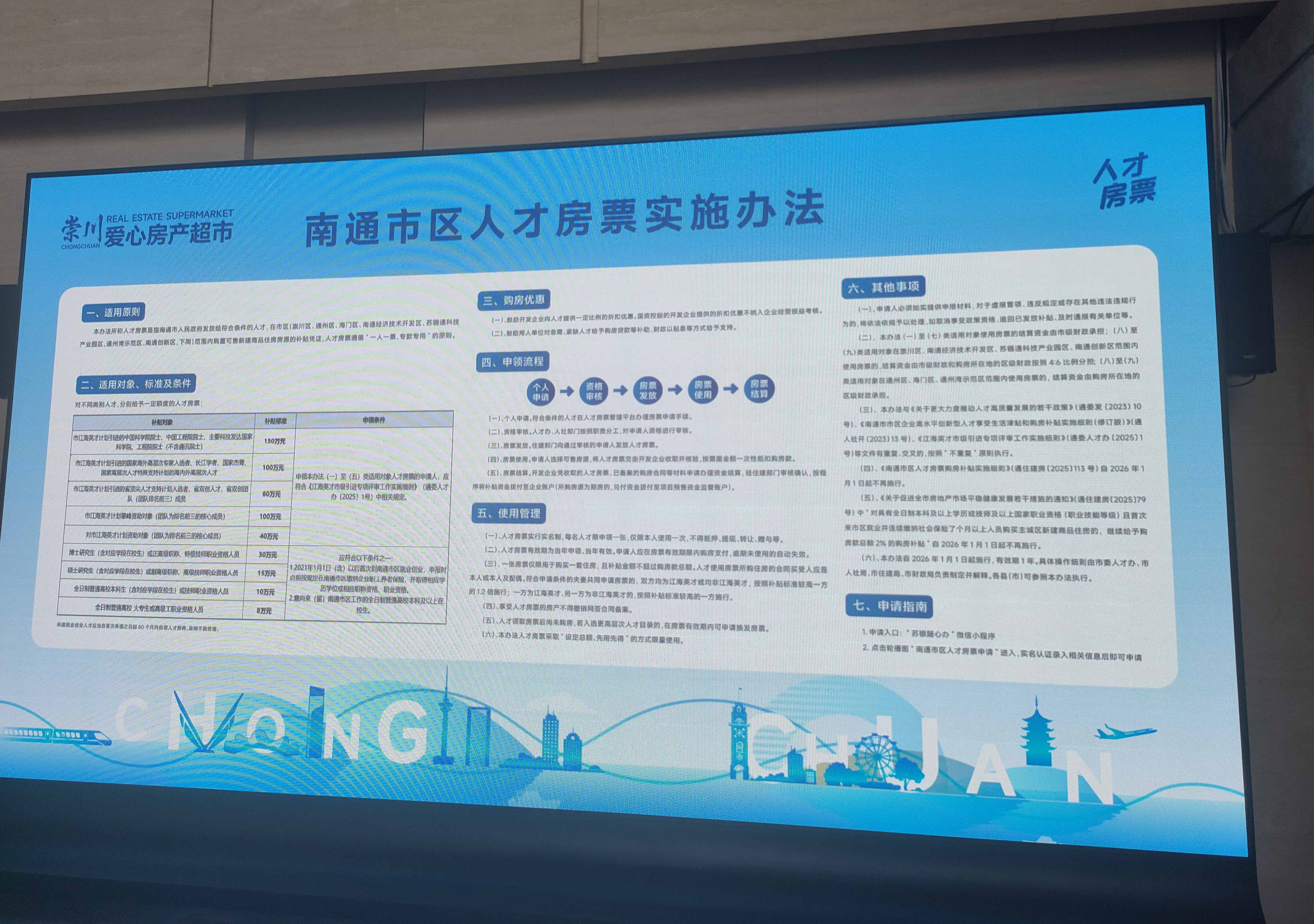 护航人才安居路,崇川不仅有“一线推介”,更有“一站服务”。在爱心房产超市,崇川区专门设立人才房票政策咨询专窗,梳理公示区内参与新政楼盘清单;同时联动南通市不动产登记中心,打造一站式便民服务点,实现契税缴纳、不动产权证办理等业务“一站办结”,让人才购房流程更精简、办事更高效、体验更舒心。