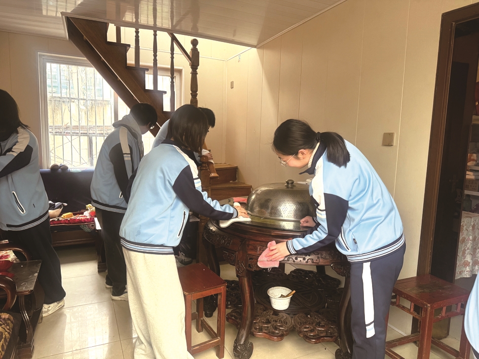 放下水果和营养品,同学们便忙碌起来。有的踮脚擦拭窗台积灰,有的弯腰清扫角落杂物。南通一中高二(7)班学生陆一平一边收拾桌面,一边轻声说:“以前总觉得学雷锋是做一件好事,今天看到爷爷虽然行动不便,却一直努力配合康复训练,我才明白,真正的坚强是在困境中依然保持对生活的热爱。我们能做的很有限,但哪怕只是让这个家更整洁一点,让老人少操一份心,也是一种传递。”