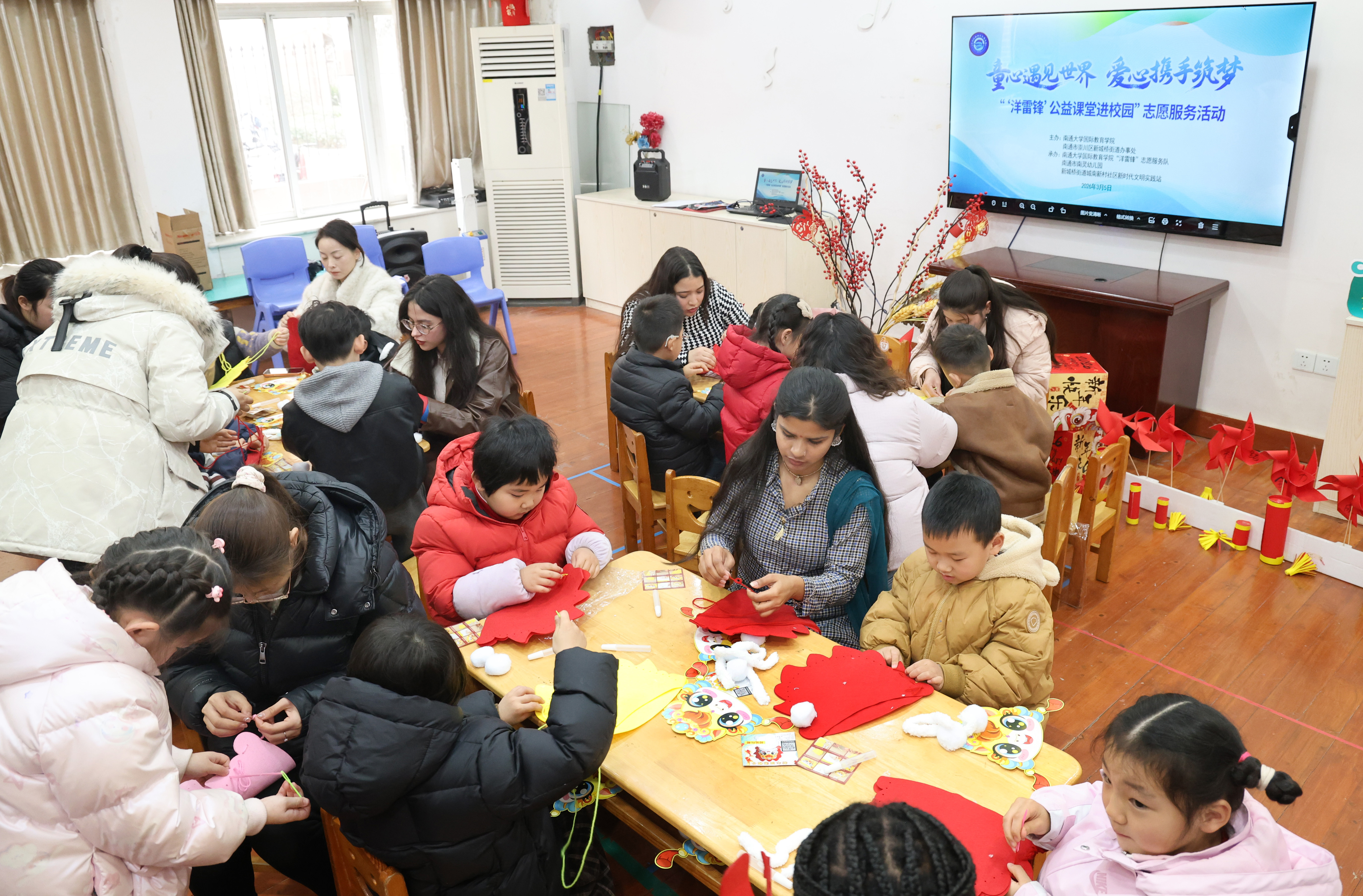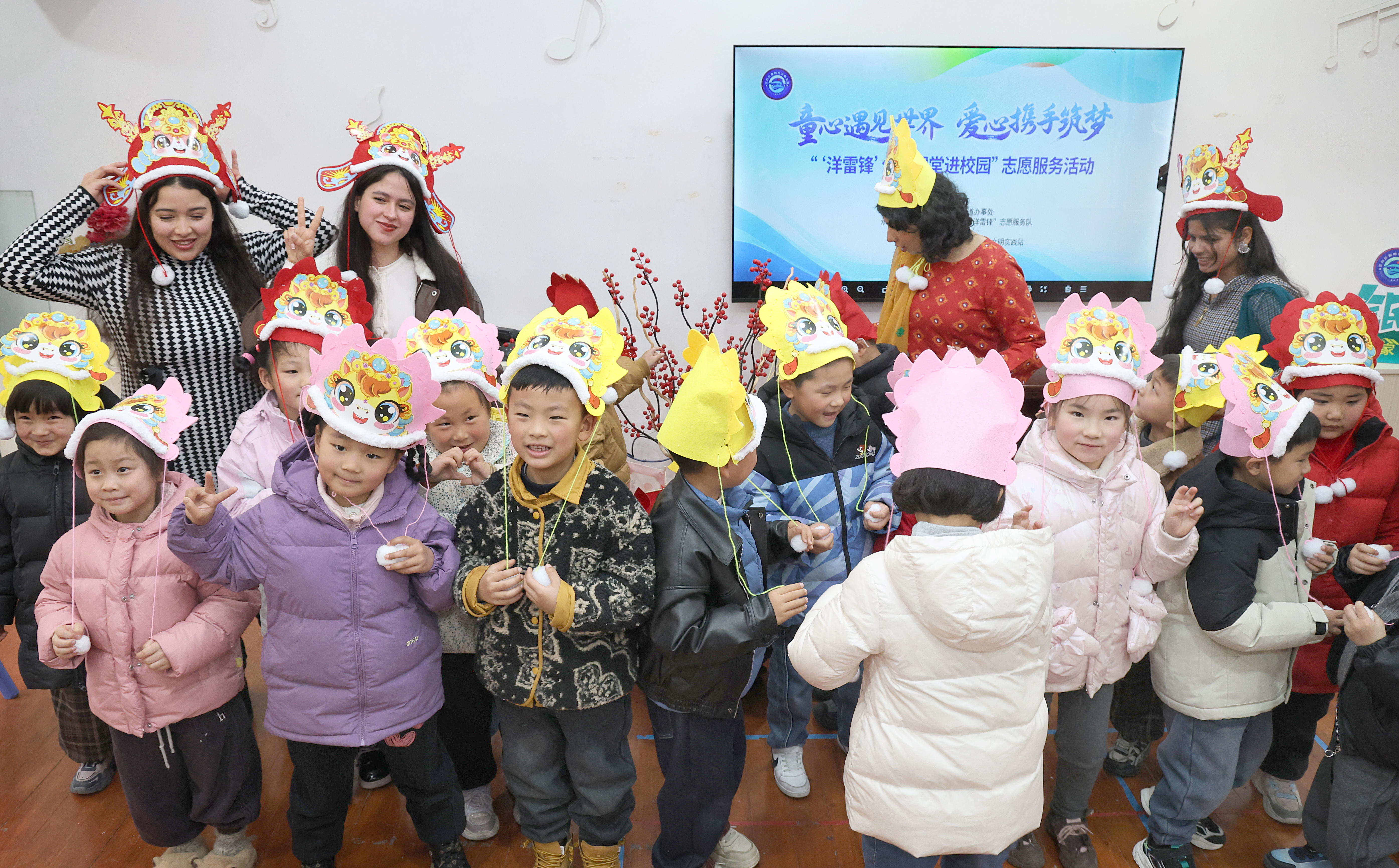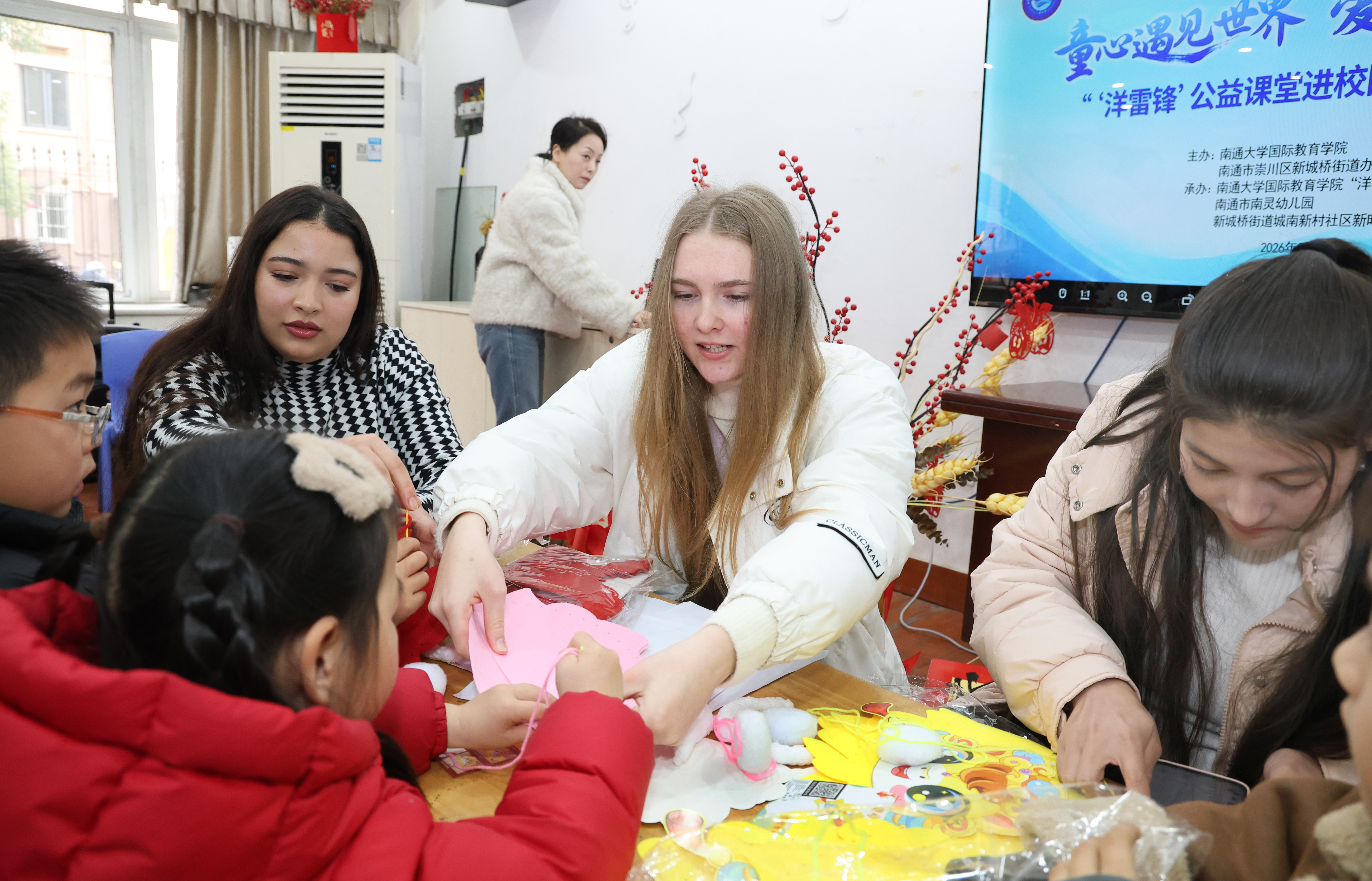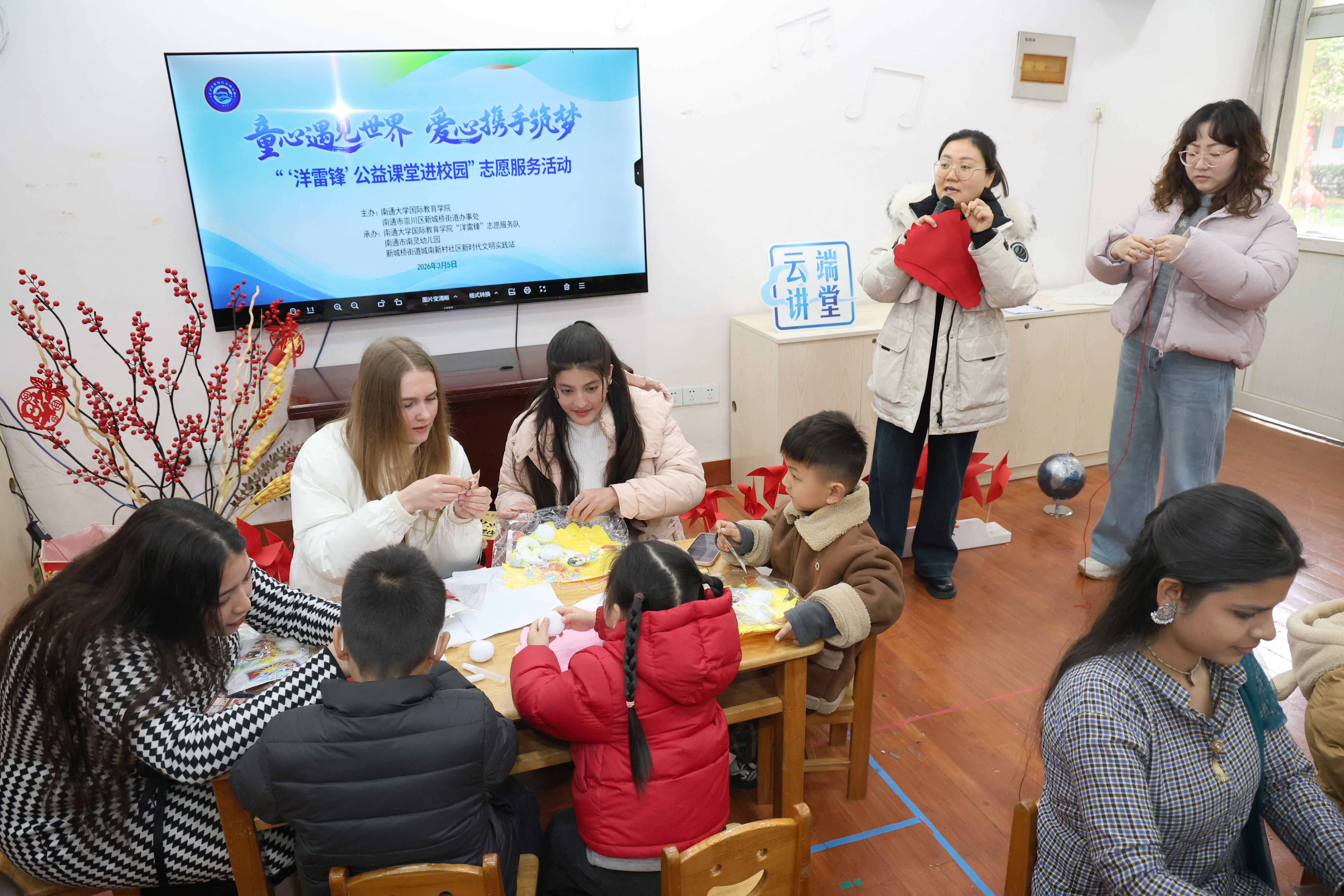 2026年3月5日,“童心遇见世界爱心携手筑梦”——“洋雷锋”公益课堂走进崇川区新城桥街道南灵幼儿园,来自巴基斯坦、尼泊尔、俄罗斯、纳米比亚等国家的“洋雷锋”们与小朋友进行丰富多彩的互动、游戏,并一起制作状元帽。