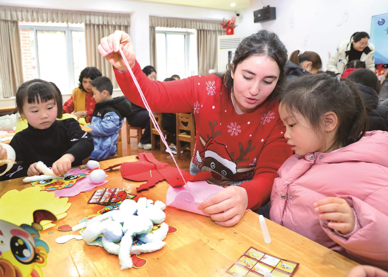3月5日,“洋雷锋”公益课堂走进崇川区新城桥街道南灵幼儿园,来自巴基斯坦、俄罗斯、纳米比亚等国家的“洋雷锋”与小朋友进行丰富多彩的互动和游戏,并一起制作状元帽。据介绍,南通大学国际教育学院“洋雷锋”志愿服务队成立10多年来,已有来自65个国家的数百名留学生先后加入。 记者许丛军