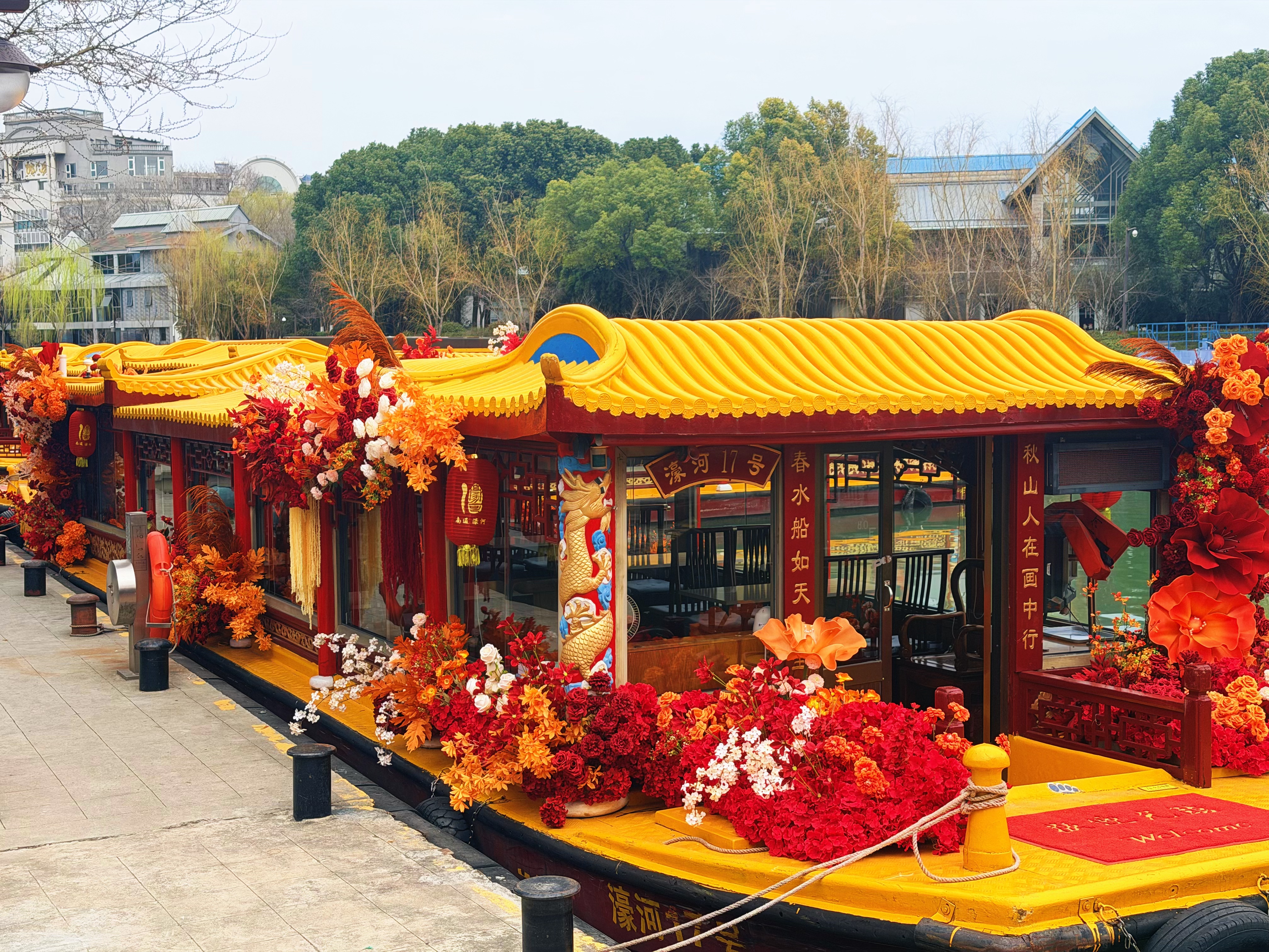 本次限定花船依托经典的“濠河夜画”线路打造,由原有画舫船精心焕新升级,全程不增设复杂演艺,专注于质感视觉包装。船身外围精心装点了月季、百合等各色春日繁花,以红橙为主色调,既与画舫船身颜色相呼应,又打造了“春日繁花绕船行”的唯美景致,让游客置身花海,尽赏濠河春日别样风光。值得一提的是,游览中还特设暖心赠花互动,所有购买花船专属票的游客,登船时均可获赠新鲜百合一枝,船舱内亦以百合为主花精心布置花艺瓶饰,将春日芬芳与“百年好合”的美好祝福一同送上,让旅途满溢温柔与诗意。