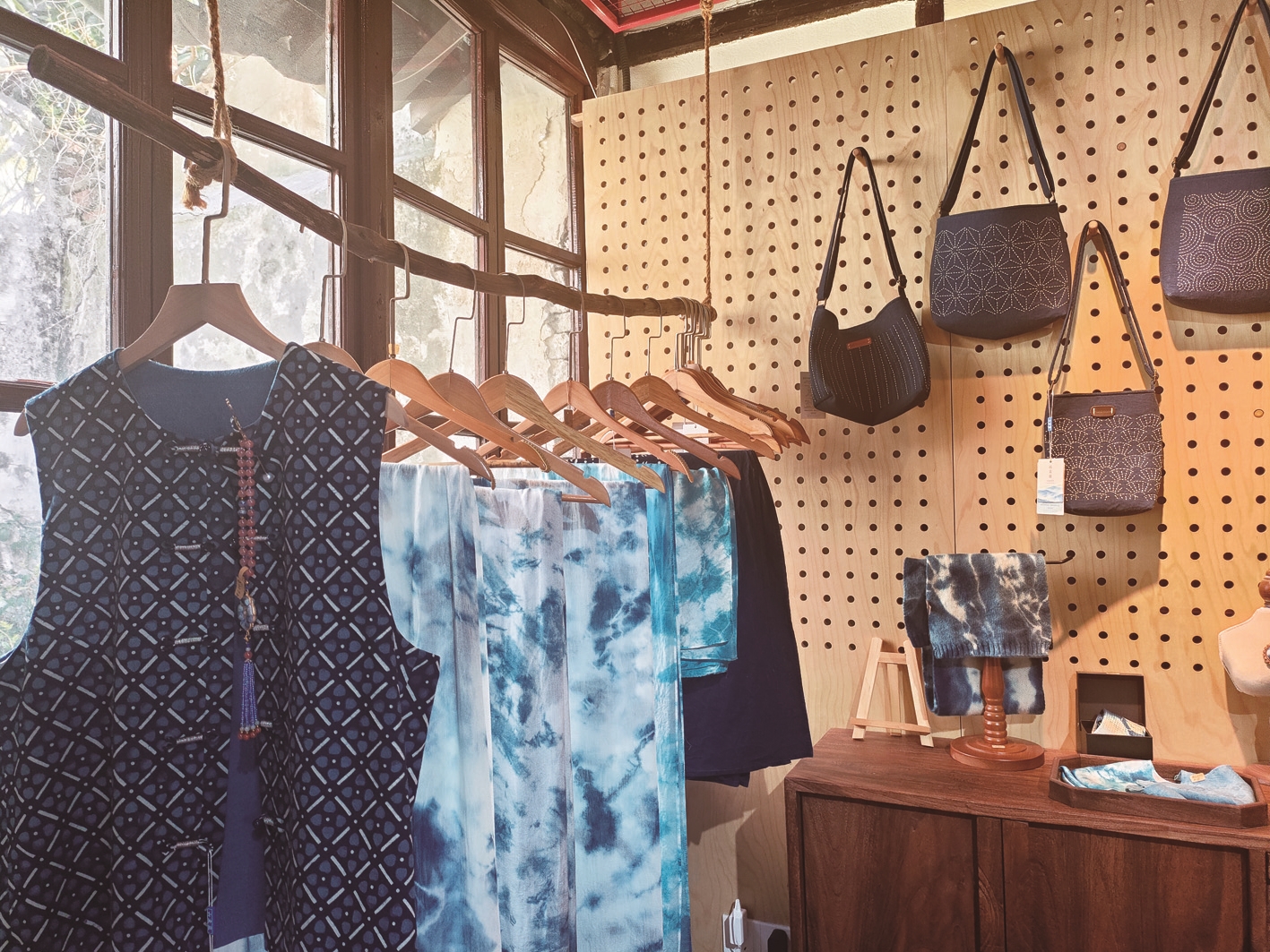从寺街缓步深入,一间名为“山麦蓝蓝染”的小店里,总是人气不减。两只憨态可掬的蓝染布艺小熊端坐在店外的木椅上,年轻人三五成群,围着它们拍照打卡。推门而入,像是掉进了一片靛蓝色的梦境。布艺挂饰、手作首饰、衣裙包袋……每一件蓝染作品都在光影里静静呼吸。