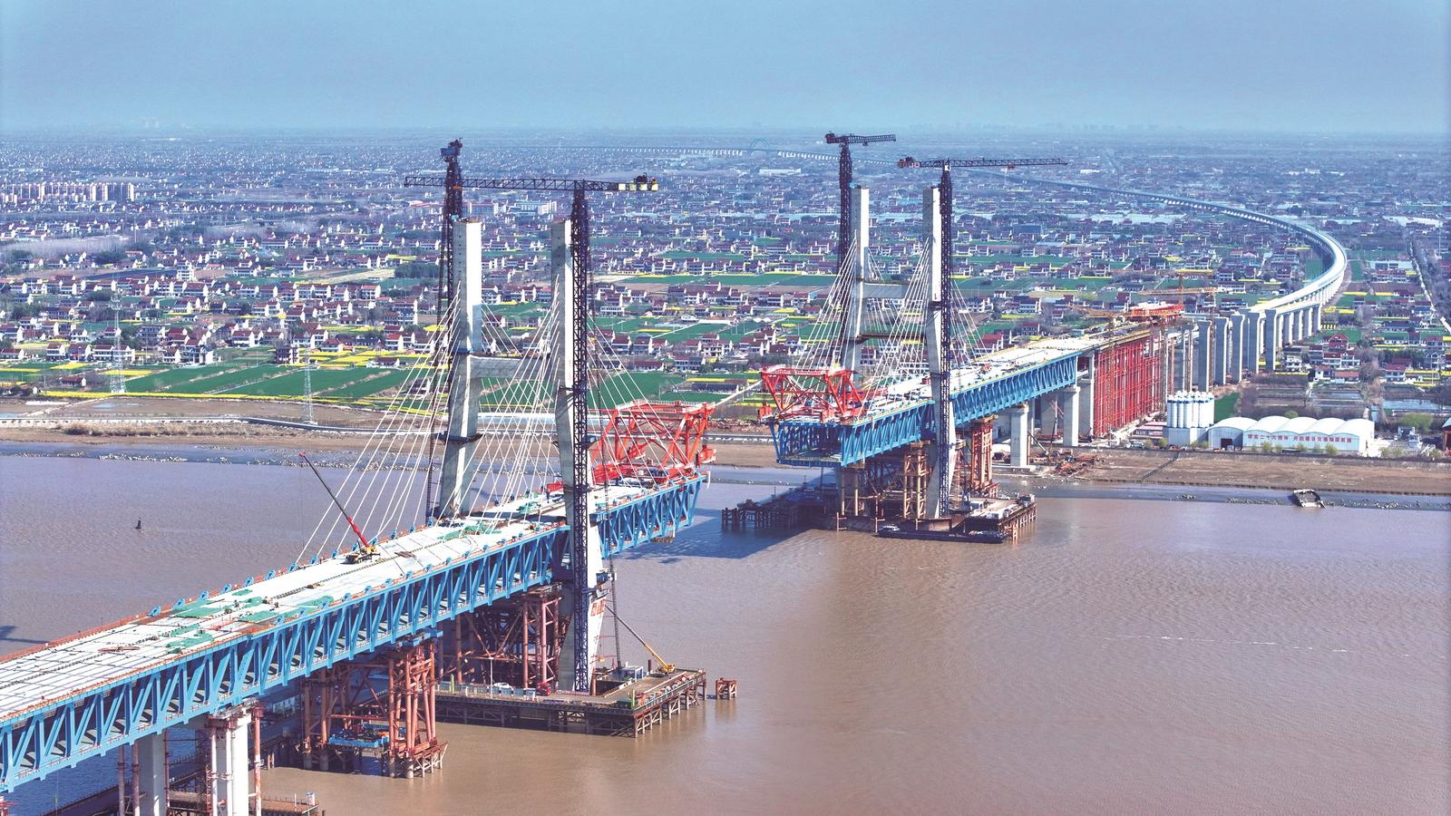 崇启公铁长江大桥正在进行斜拉索挂设施工。 李梦竹摄