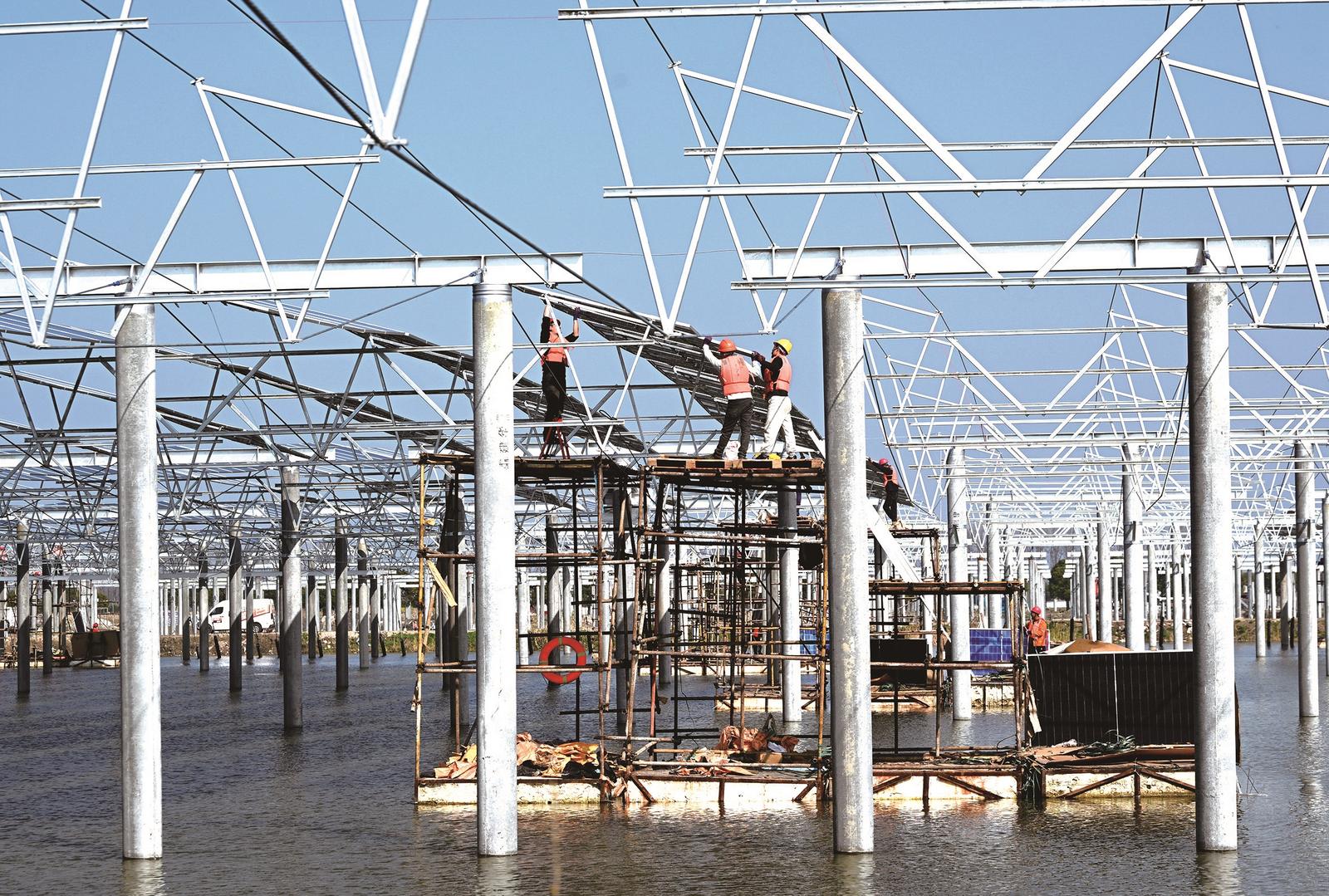 25日,在海安市大公镇群益村“渔光互补”项目施工现场,工人们正加紧进行光伏支架、组件安装。