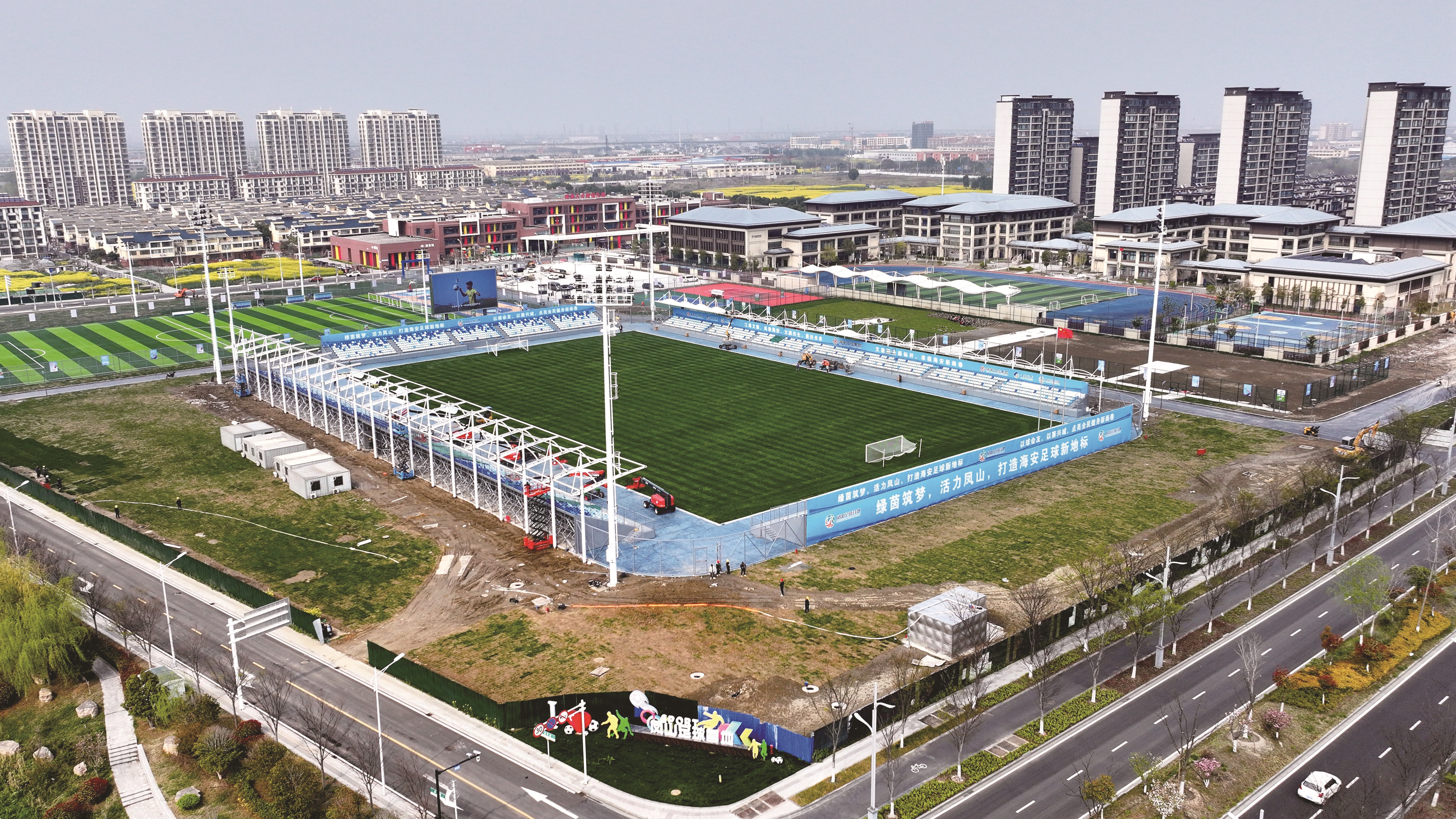 昨天,工人们正在海安凤山足球营地项目建设现场加紧施工。6日,首场足球友谊赛将在此开战。