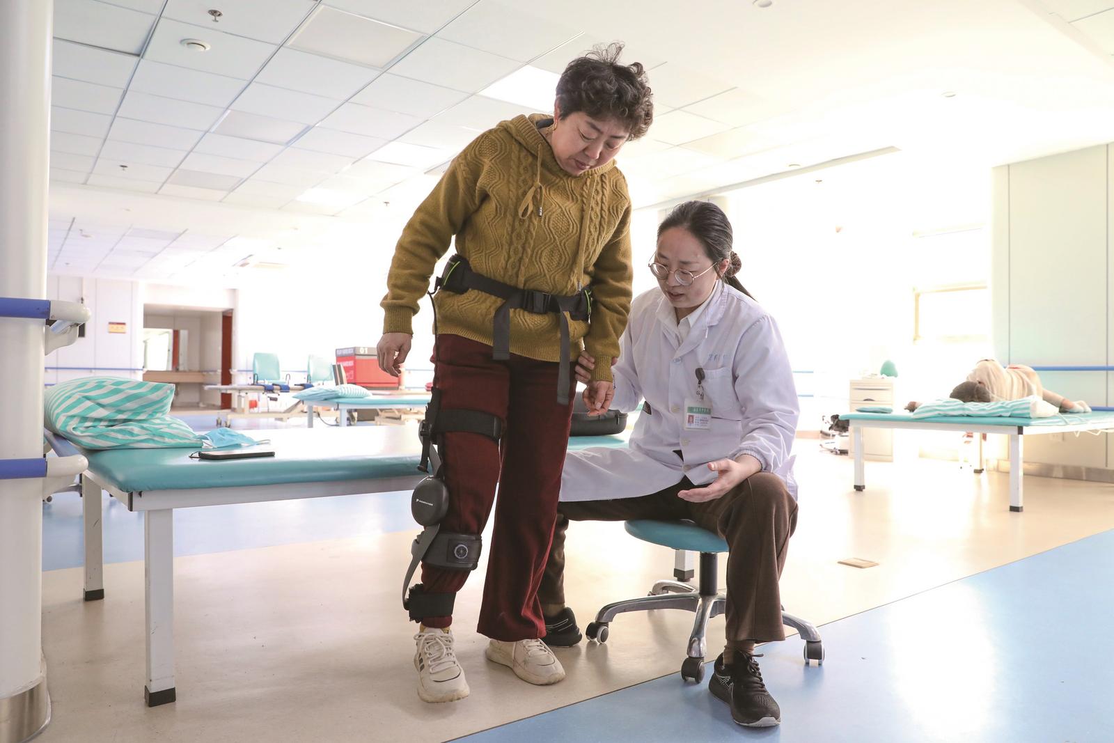 昨日,在海安市中医院康复训练中心,患者正在治疗师指导下穿戴外骨骼机器人进行康复训练。去年以来,该中心引进外骨骼机器人,利用AI运动引擎,依托高精度传感器演算,更好地辅助下肢肌力不足患者进行步行训练。