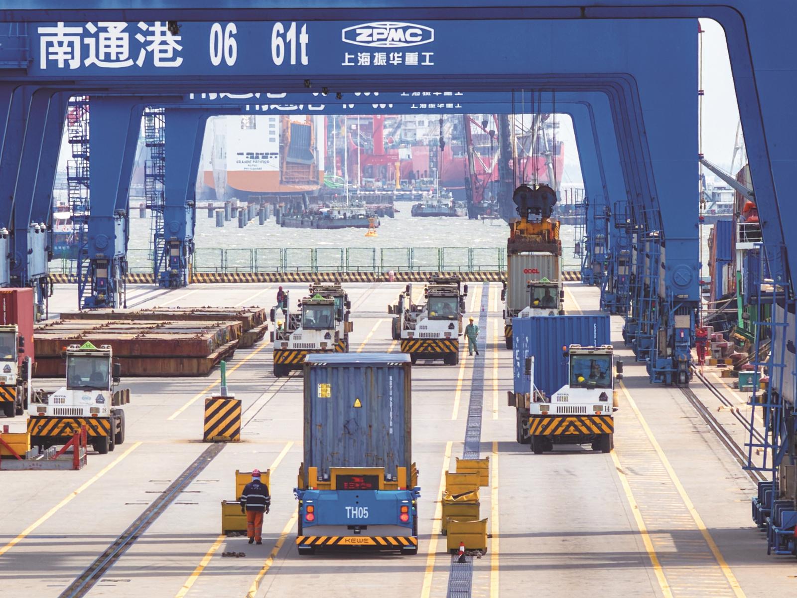 8日,南通港通海港口码头一片繁忙。一季度,通海港口完成集装箱吞吐量38.93万标箱,作业链条安全顺畅、运转高效。通海港口是海轮进入长江12.5米深水航道后北岸的第一个港区,也是南通重点打造的现代化集装箱港区和江海联运枢纽港。 记者 许丛军摄