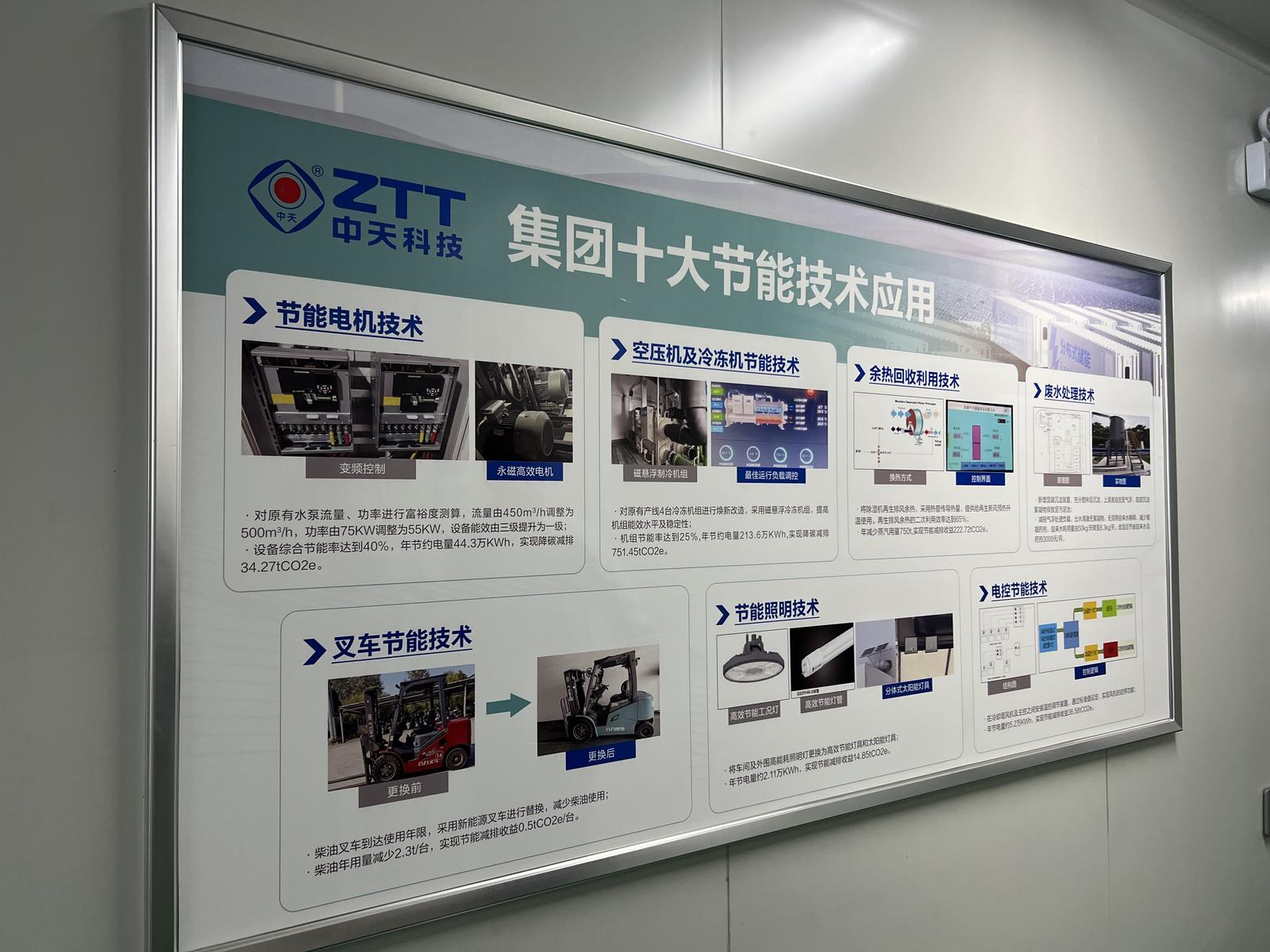 中天储能电芯生产车间走廊墙壁上张贴了集团十大节能技术以及具体案例。
