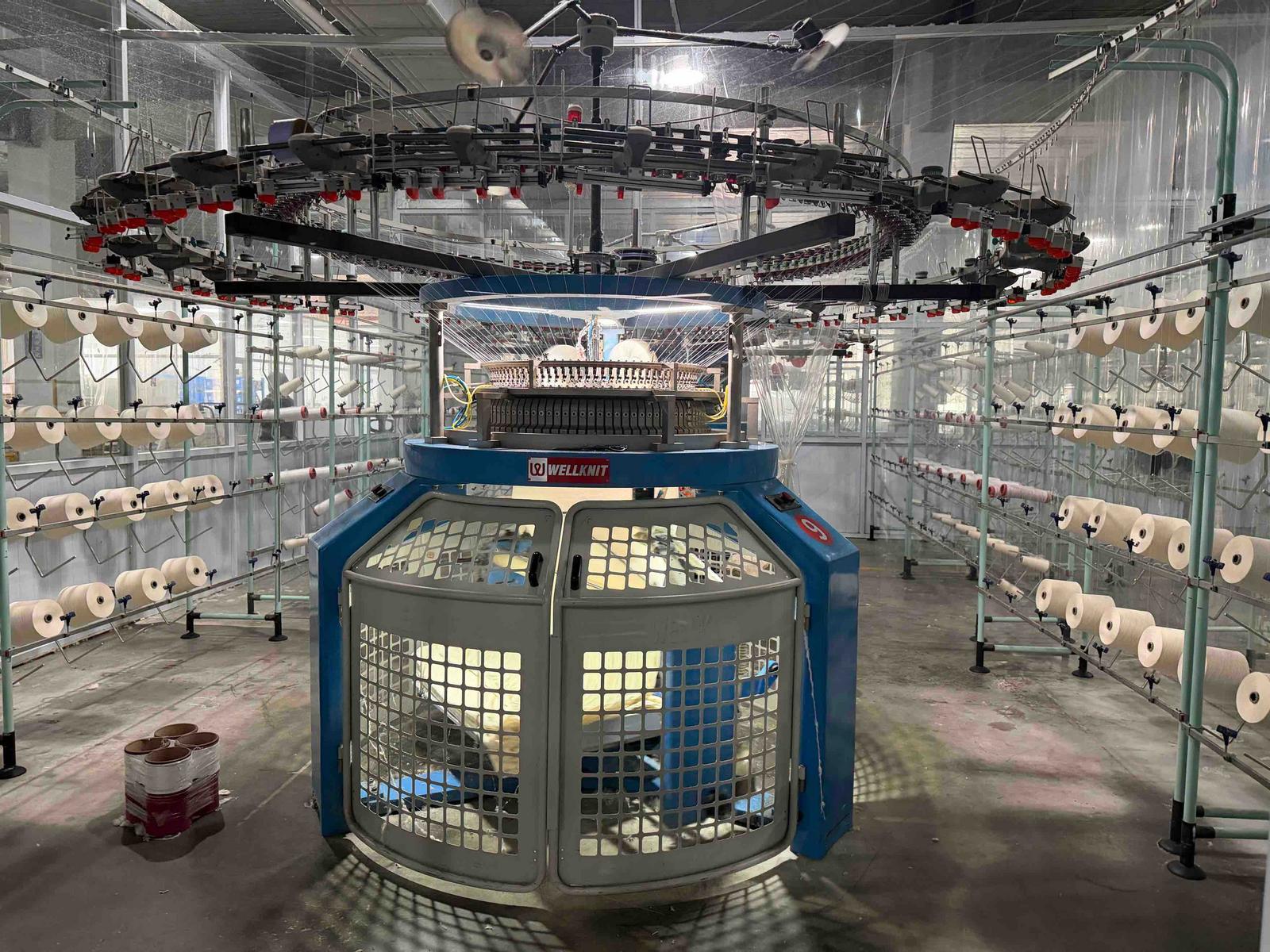海盟纺织车间内的针织大圆机正在高速运转。