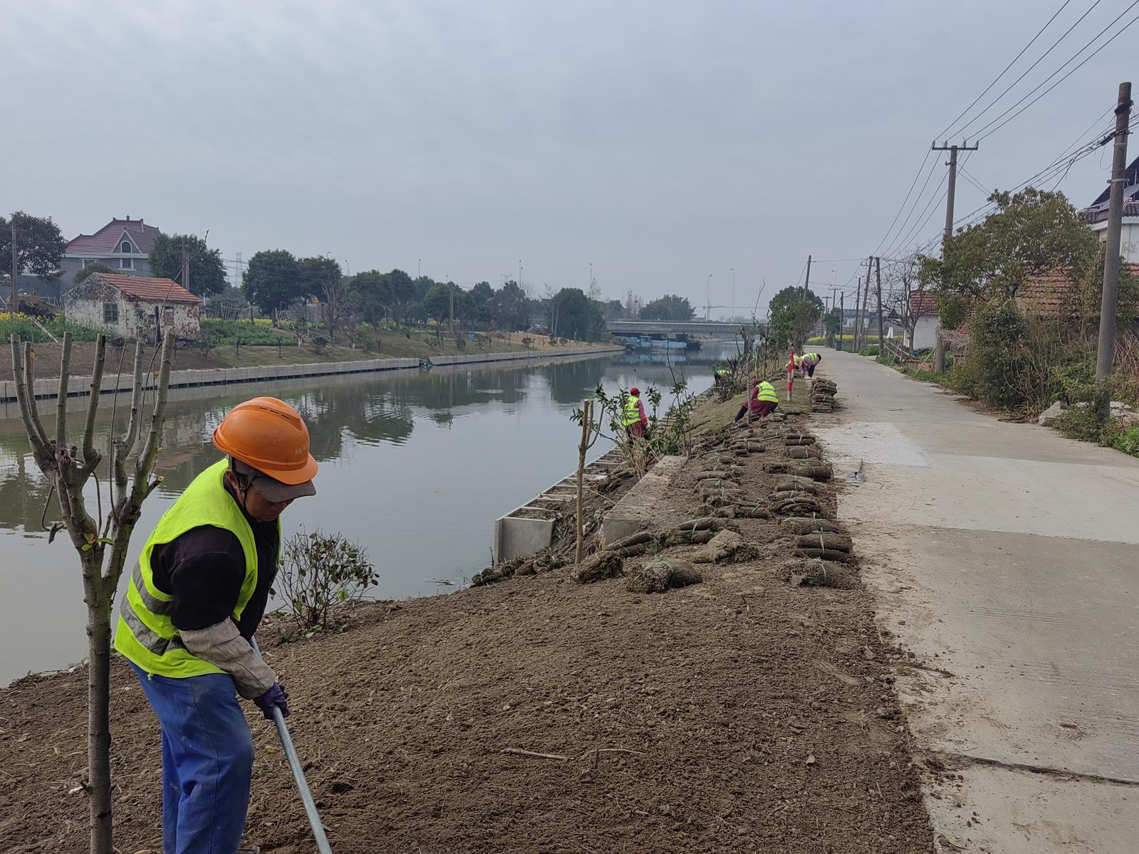 7日,站在南通市通州区金沙街道运盐河西桥上举目四望,只见和煦春光下,整齐划一的生态框护岸沿河岸延伸,河坡平整紧实,工人们正忙着进行坡面修整、细节完善和绿化补植。