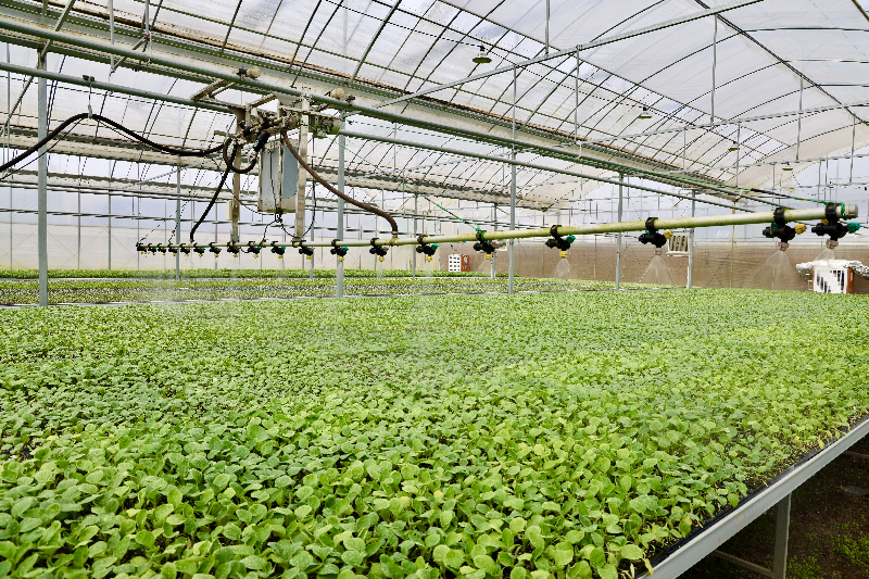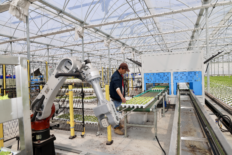 与A+温室工场遥相呼应的正余镇智慧农业示范园内处处可见科技赋能的身影——智能环控系统可实现温度、湿度的精准调控,并自动完成补光与遮阳;在生产区,播种机高效作业,移苗机精准栽植,机械臂平稳抓取秧盘,转移机器人往来运输,潮汐苗床科学培育幼苗……各个环节衔接顺畅、高效有序;水培池中,生长旺盛的生菜正舒展叶片,恣意生长,实现了绿色、无污染种植。