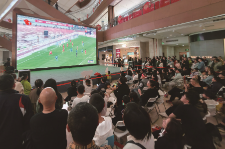 赛场的激情从不局限于一处,在滨江国际邮轮中心,赛场之上的激烈拼抢引得屏幕前阵阵沸腾。“原本以为下雨天人会少,没想到大家围坐在一起看球,氛围反倒更燃了!”滨江道业主王峰拍照打卡、连连点赞。