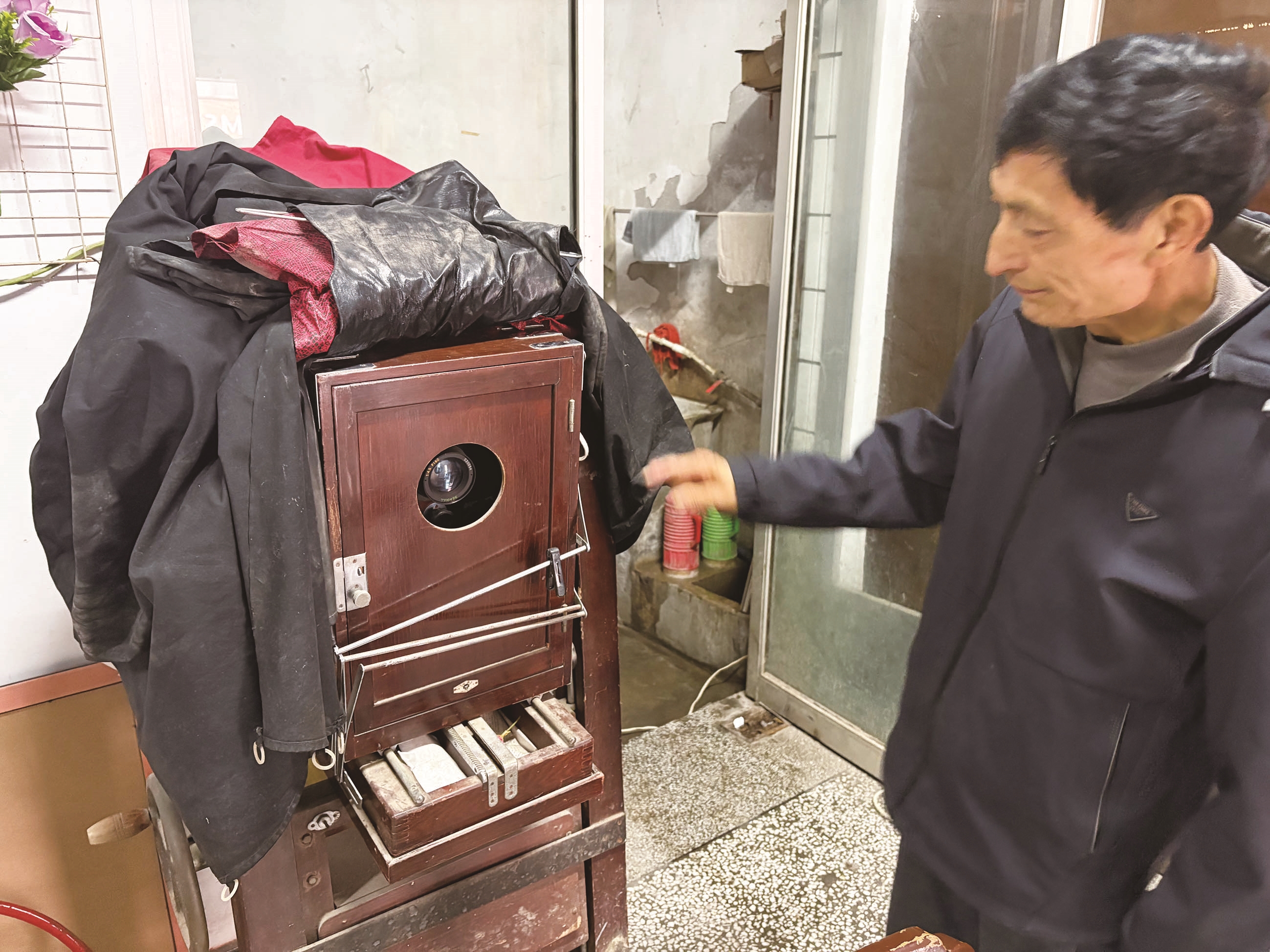 沈国强展示老照相机。