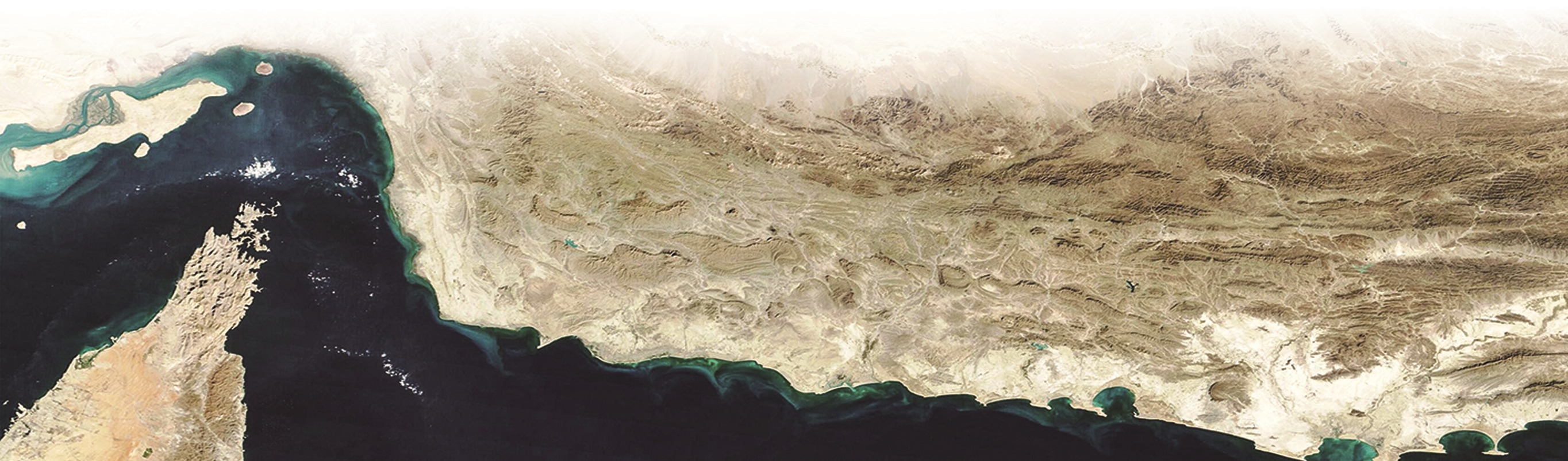 美国国家航空航天局(NASA)的Terra卫星获取的这张自然色手绘图显示了阿曼湾、伊朗南部和巴基斯坦西南部的马克兰地区(中)以及霍尔木兹海峡(左)和阿曼北部海岸(底部)。CFP供图