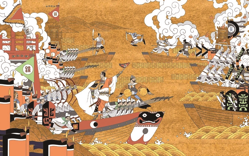 ◀杭州钱王祠内狼山江之战壁画。