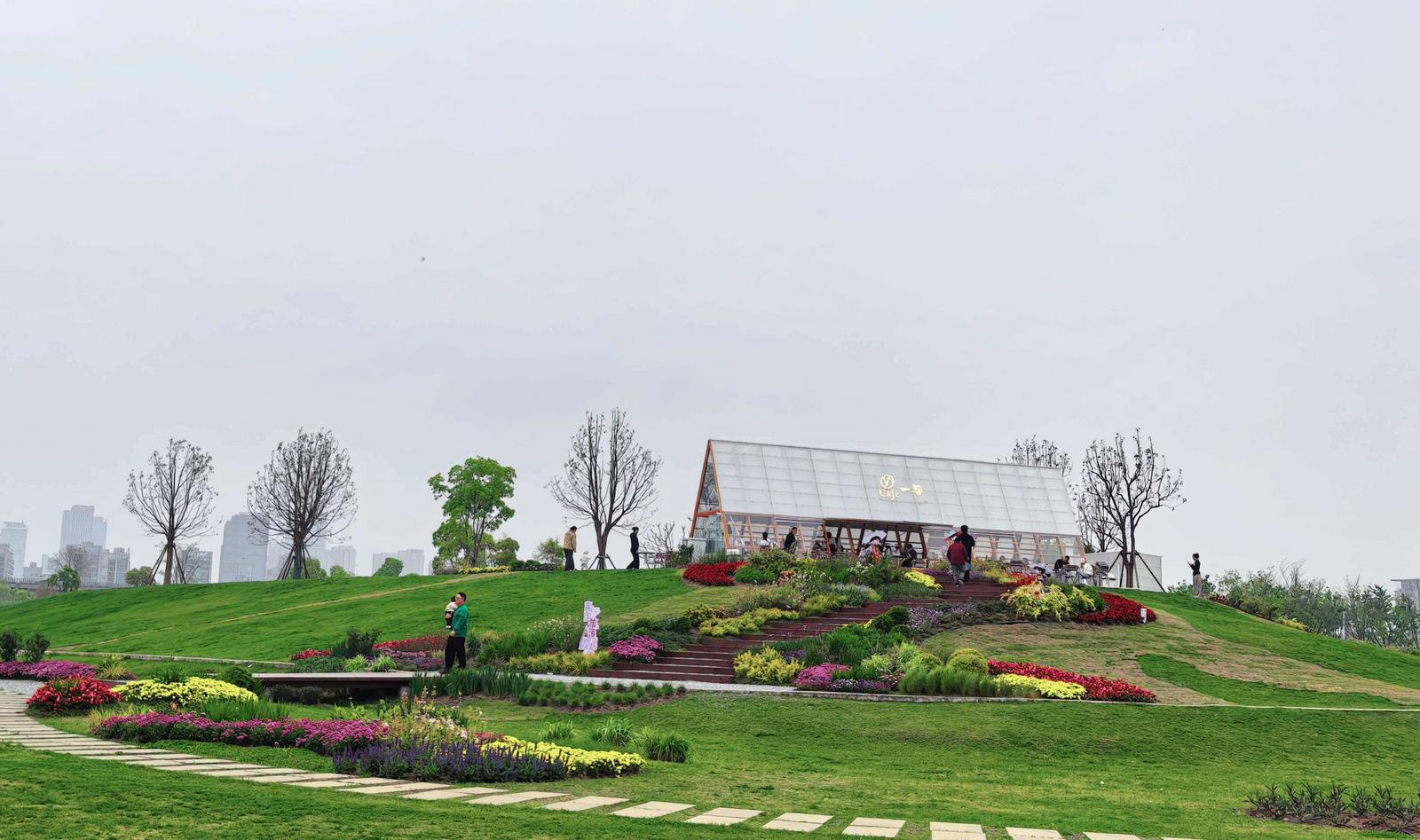 滨江花海之上,金色花田与壮阔长江岸线交相辉映,毗邻的长江体育公园赛事精彩纷呈,市民漫步花间绿道、骑行江畔长廊、滑草嬉戏、放飞纸鸢,尽享春日休闲时光。依托江畔花境打造的“一朵”系列森系玻璃屋咖啡店,入驻花海后迅速火爆出圈,成为新晋网红打卡点。