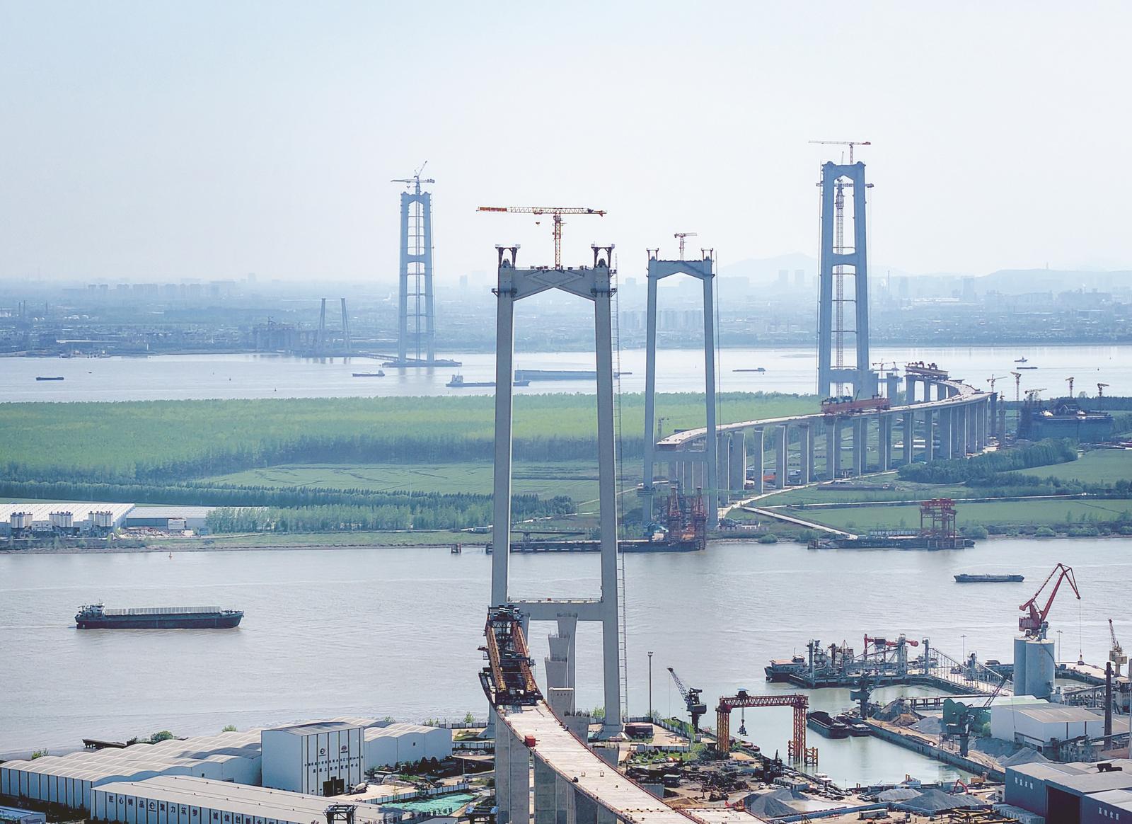 张靖皋长江大桥施工正酣 四座主塔同框亮相