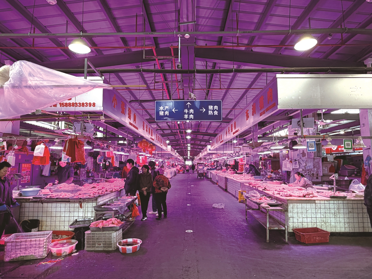 在另一家“小齐猪肉”摊位,摊主正忙着用火枪处理猪蹄上的猪毛。面对记者咨询,她手上动作不停,热情介绍:“我们主要向食堂、饭店、工厂提供新鲜猪肉,货源主要来自安徽、河南、山东等地。前段时间,猪肉价格确实便宜,这是因为猪出栏量较多。再加上近段时间以来,老百姓对猪肉需求量较低,猪肉市场供需出现不平衡。不过,这两天价格已经有所上涨,此前猪肉7元一斤左右,现在涨到8元一斤。”